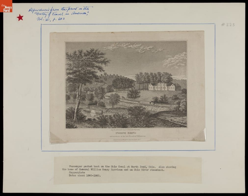 This 1840s engraving shows an Ohio River steamboat and a passenger packet boat passing by the home of President William Henry Harrison in North Bend, Ohio. The print features the Cincinnati-Whitewater Canal, which included one of only twelve canal tunnels built in the United States.