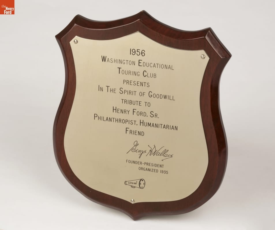 Plaque, Presented Posthumously to Henry Ford by the Washington Educational Touring Club, 1956