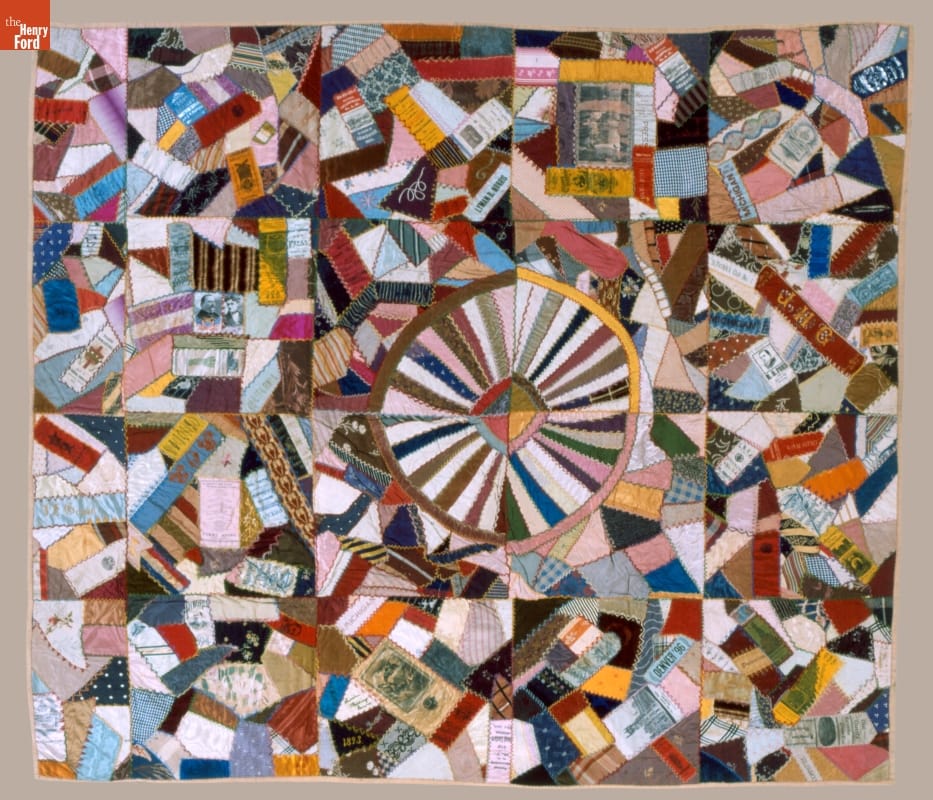 Note(s): Each individual fabric piece and each block are outlined in embroidery of a variety of feather stitches in many colors