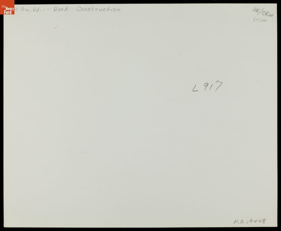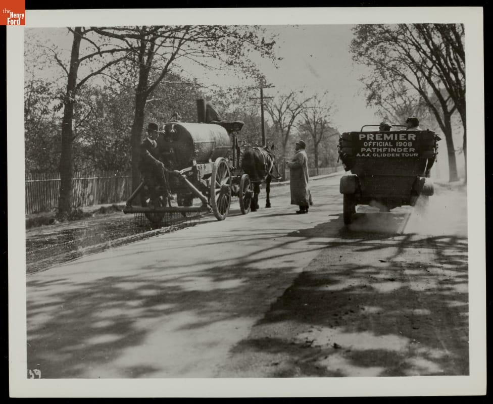 In this 1908 photograph, the driver of the Automobile Association of America's (AAA) Official Glidden Tour Pathfinder vehicle talks to a construction worker on the back of a road-oiling tank. The AAA organized Glidden Tours from 1904 through 1913. These grueling endurance runs of several hundred miles brought attention to the poor condition of American roads.