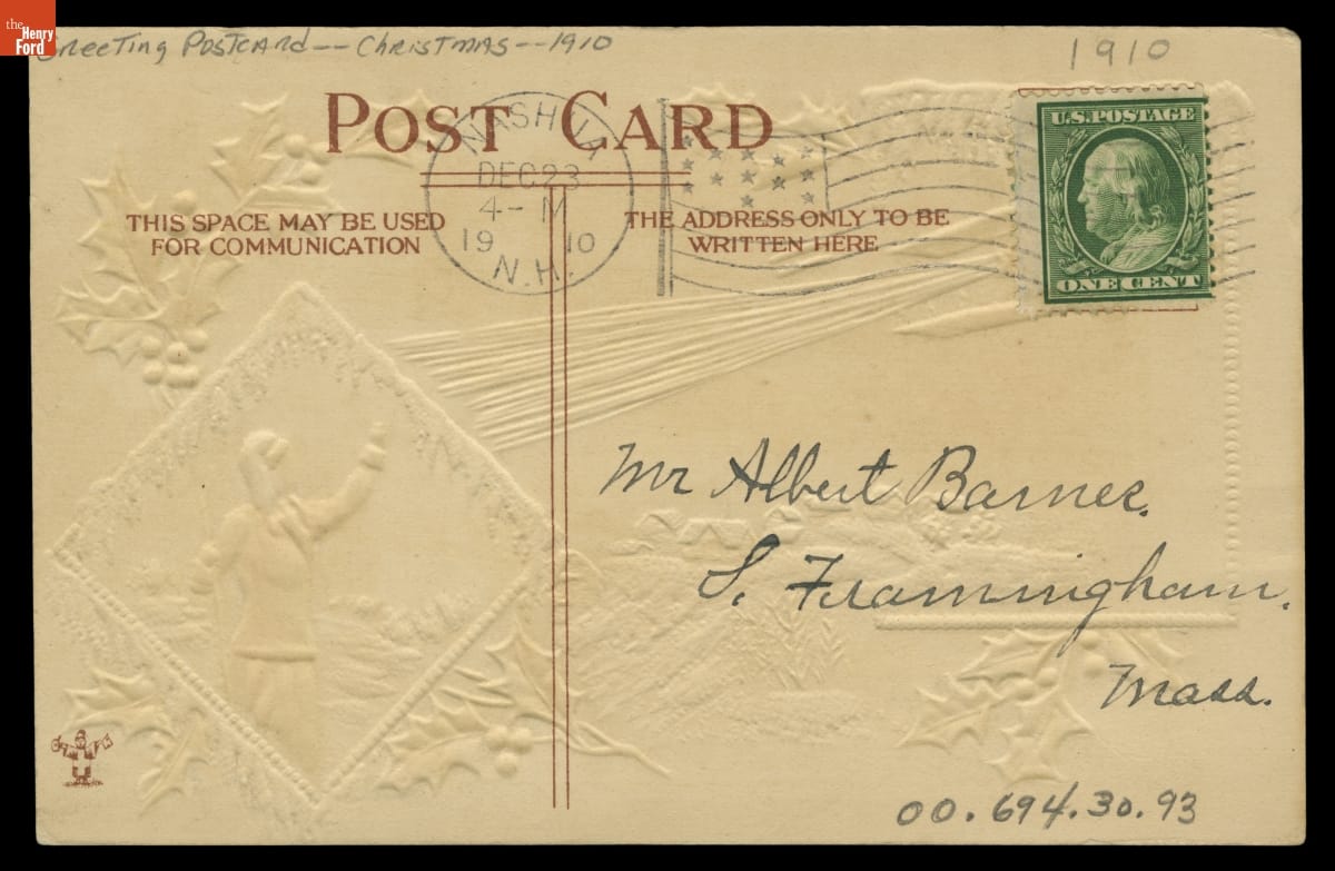 Mailing colorful, commercially designed greeting cards was a 20th-century American tradition. During the holidays, friends and neighbors commonly exchanged cards wishing the recipient a merry Christmas or happy New Year. Santa Claus, a regular feature, is sometimes depicted non-traditionally in scenes that reflect the time. When this 1910 example was published, airplanes were modern marvels.