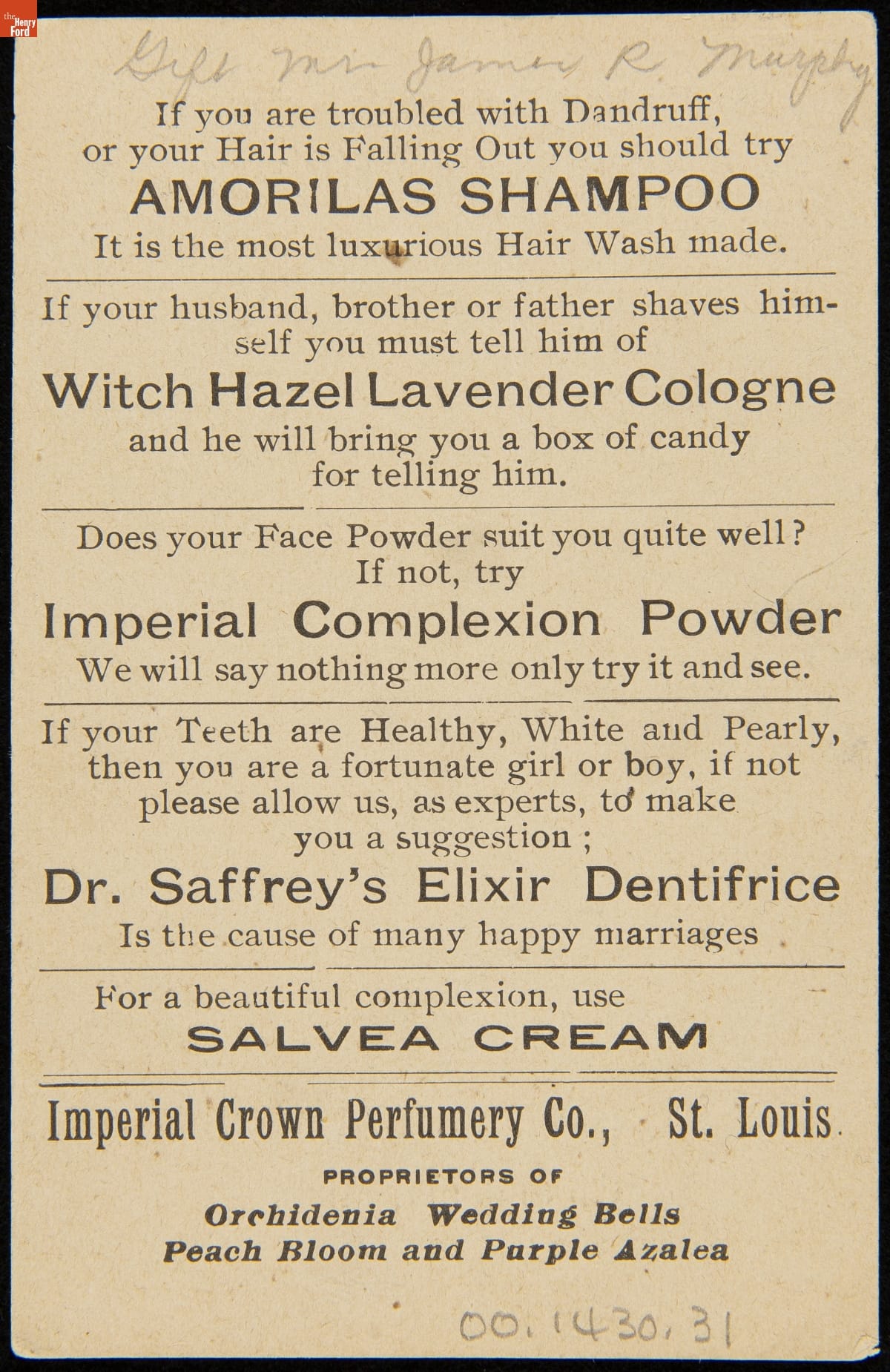 In the last third of the nineteenth century, an unprecedented variety of consumer goods and services flooded the American market. Advertisers, armed with new methods of color printing, bombarded potential customers with trade cards. Americans enjoyed and often saved the vibrant little advertisements found in product packages or distributed by local merchants. Many survive as historical records of commercialism in the United States.