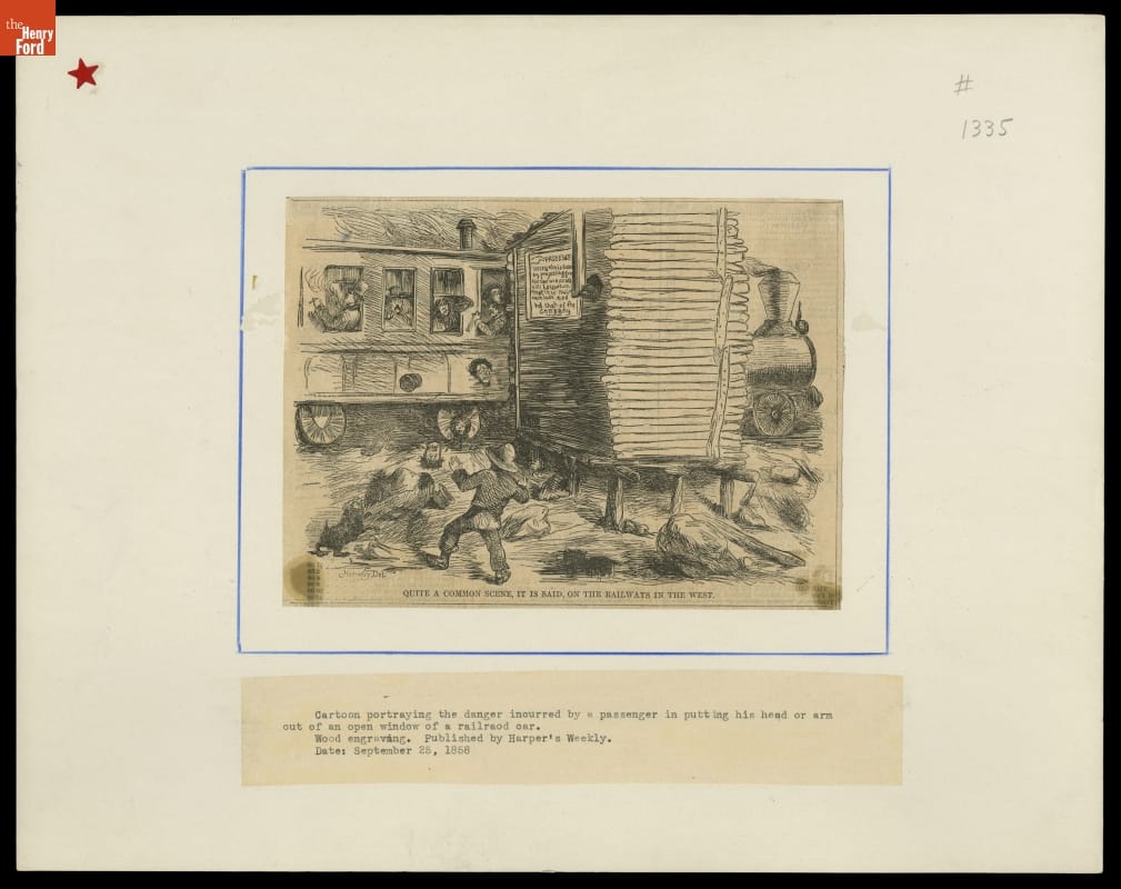 While close clearances -- tight spaces between railroad cars and trackside structures -- did exist, this 1858 illustration from Harper's Weekly exaggerated the dangers faced by passengers who stuck their heads through windows. More likely threats from an open window included sparks, cinders and smoke from the steam locomotive pulling the train -- all of which could irritate eyes and damage clothing.