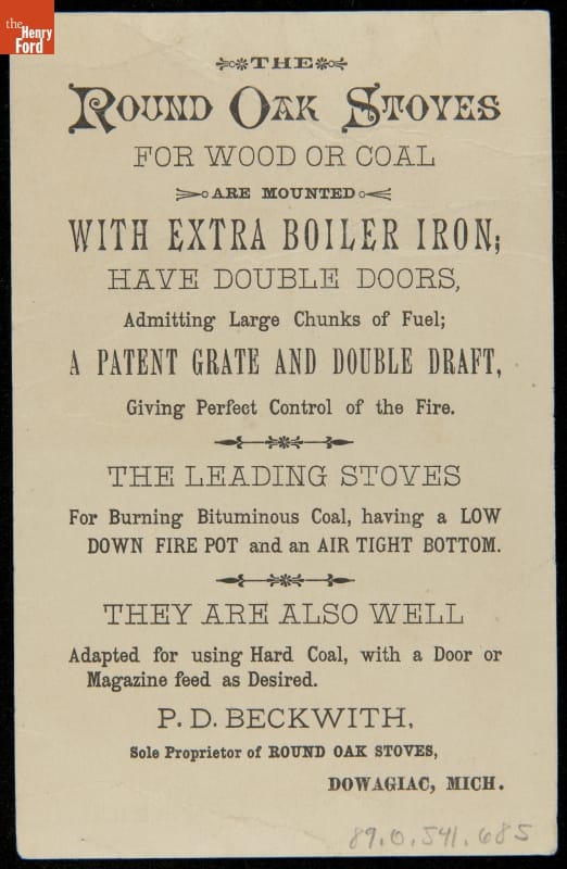 Advertised product made by P.D. Beckwith and Round Oak Stove Company, Dowagiac, Michigan. Retailed by F.F. Palmer & Son in Hudson, Michigan. Card lithographed by Sinclair & Son, Philadelphia, Pennsylvania