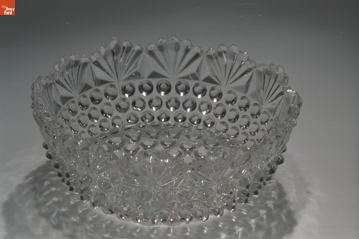 Nineteenth-century American glassmakers experimented with new methods to create products for a growing consumer market. In the 1820s, pressing glass into metal molds by machine was perfected, and by the mid-1800s, manufacturers were creating a variety of inexpensive pressed glass housewares. America's middle-class consumers could now decorate their homes with attractive glass bowls, creamers, dishes, plates, vases, and other tableware.