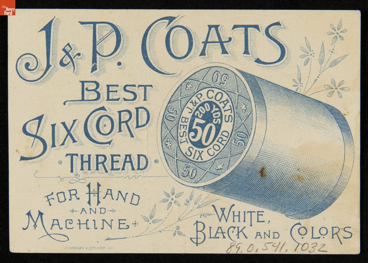 As color printing gained momentum in the late 19th century, trade cards became a major means of advertising goods and services. Americans enjoyed and often saved the little advertisements found in product packages or distributed by local merchants. This trade card advertises Six Cord Thread from J. & P. Coats Company.