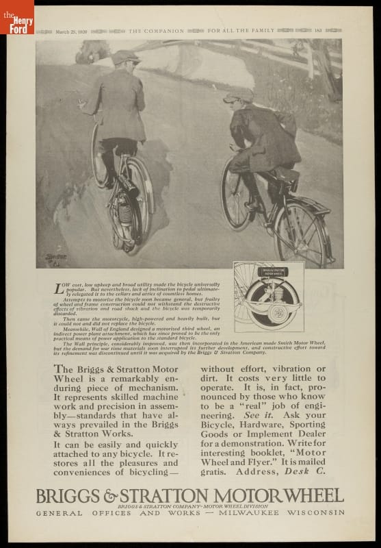 Around 1920, if a cyclist was tired of pedaling or his bicycle had been relegated to storage, the Briggs & Stratton Company of Milwaukee, Wisconsin, provided another option. The Motor Wheel, a four-stroke, single-cylinder gasoline engine, could attach to a bicycle and propel it down the road. The company produced the Motor Wheel from 1919 to 1924.