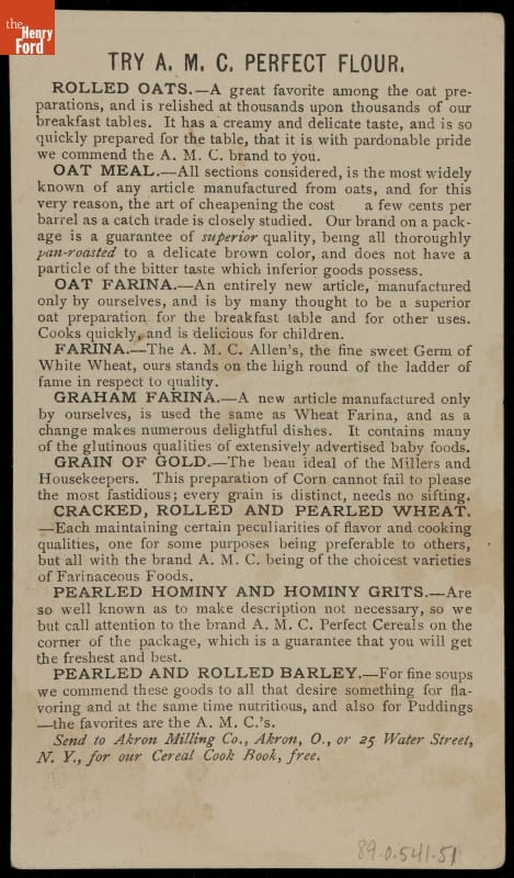 Trade Card for AMC Perfect Cereals, Akron Milling Company, 1884-1891