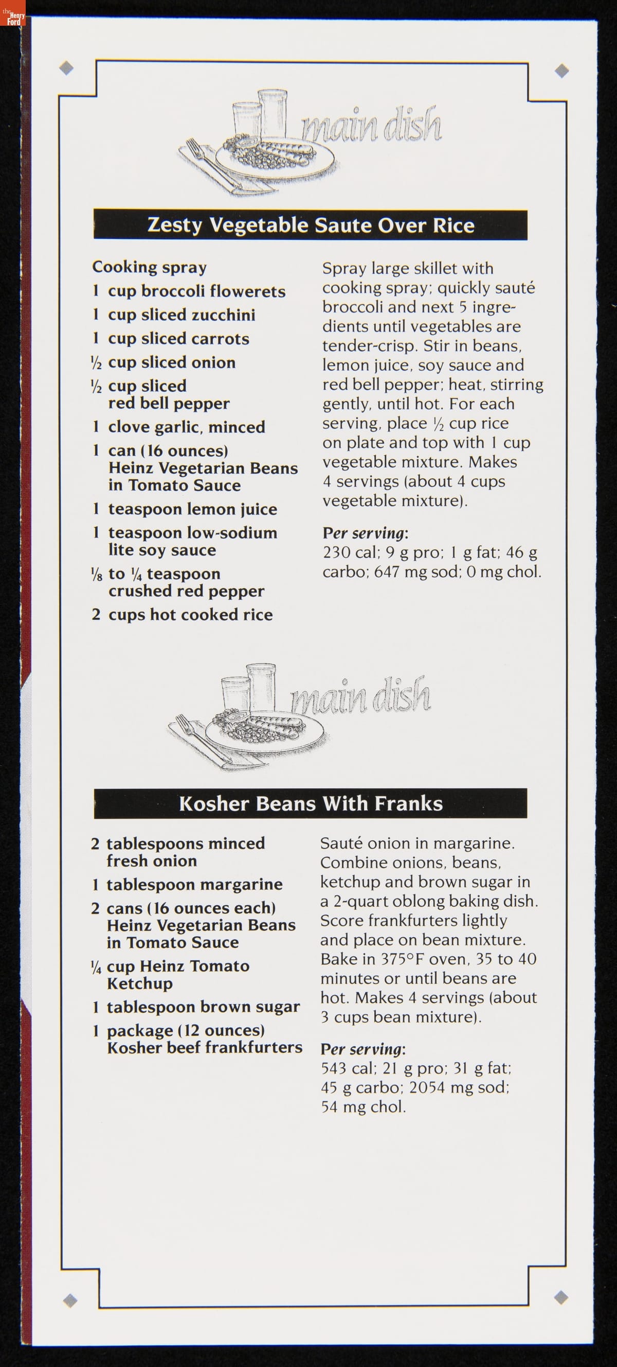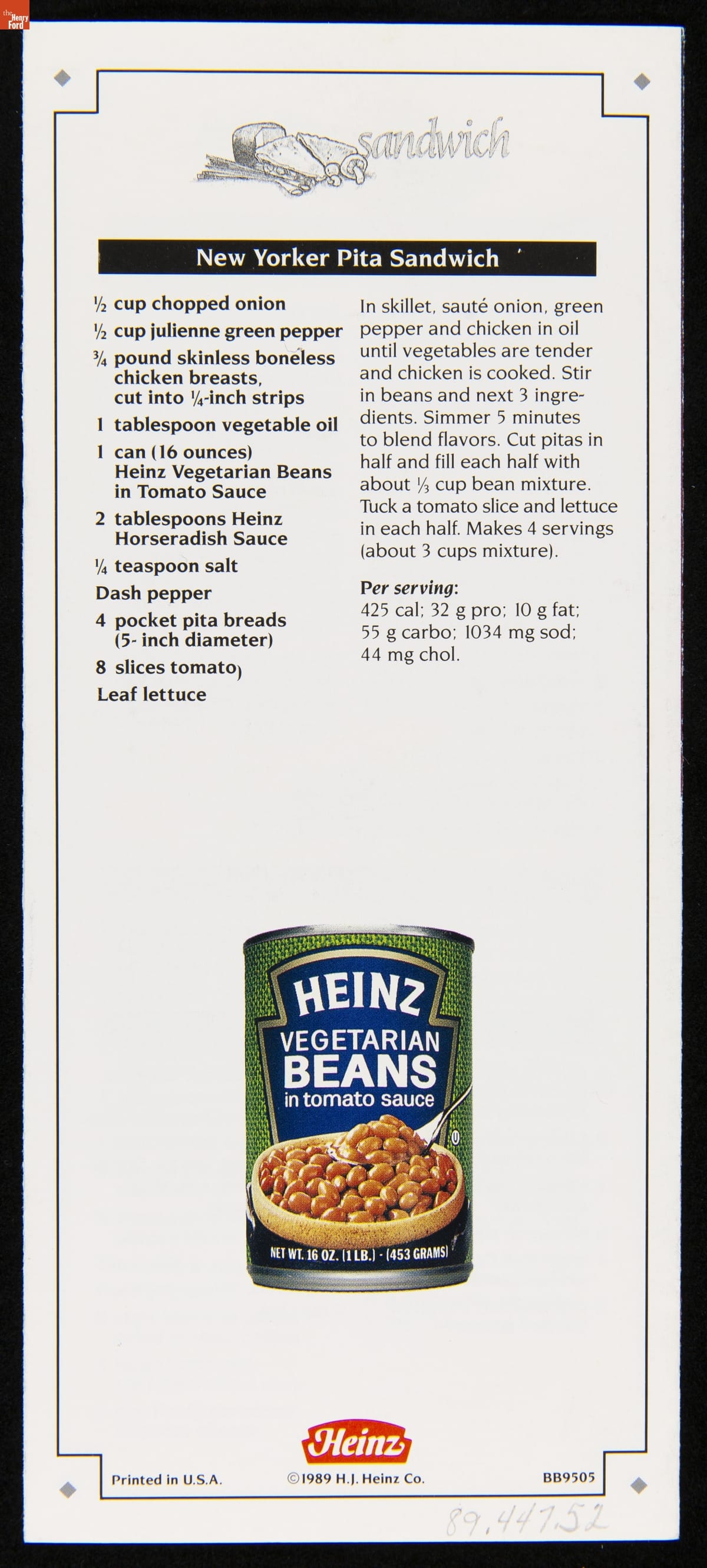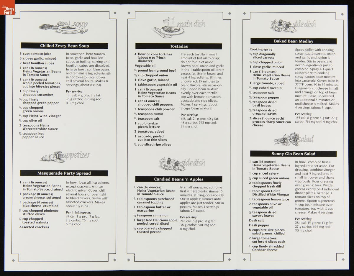 Like other manufactured food companies, the H.J. Heinz Company produced recipe booklets and publications to promote their products. This leaflet from 1989 features recipes for kosher dishes utilizing Heinz Vegetarian Beans products.