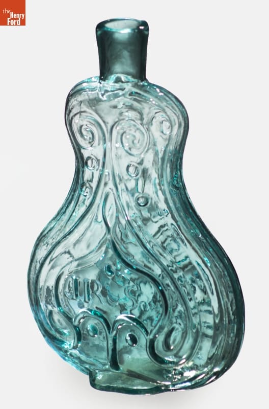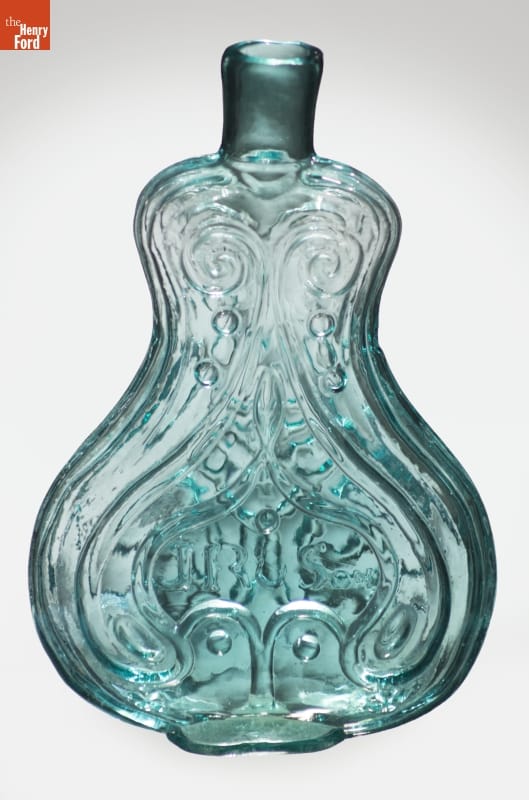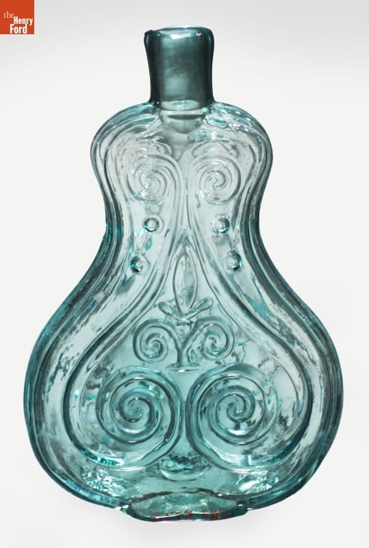 Glass factories in America began producing inexpensive, mold-formed flasks in the early 1800s. These figured flasks appealed to America's common man. Many of these flasks contained symbols of national pride or political or cultural affiliation. Embellishments on other flasks, like this one, were purely decorative.