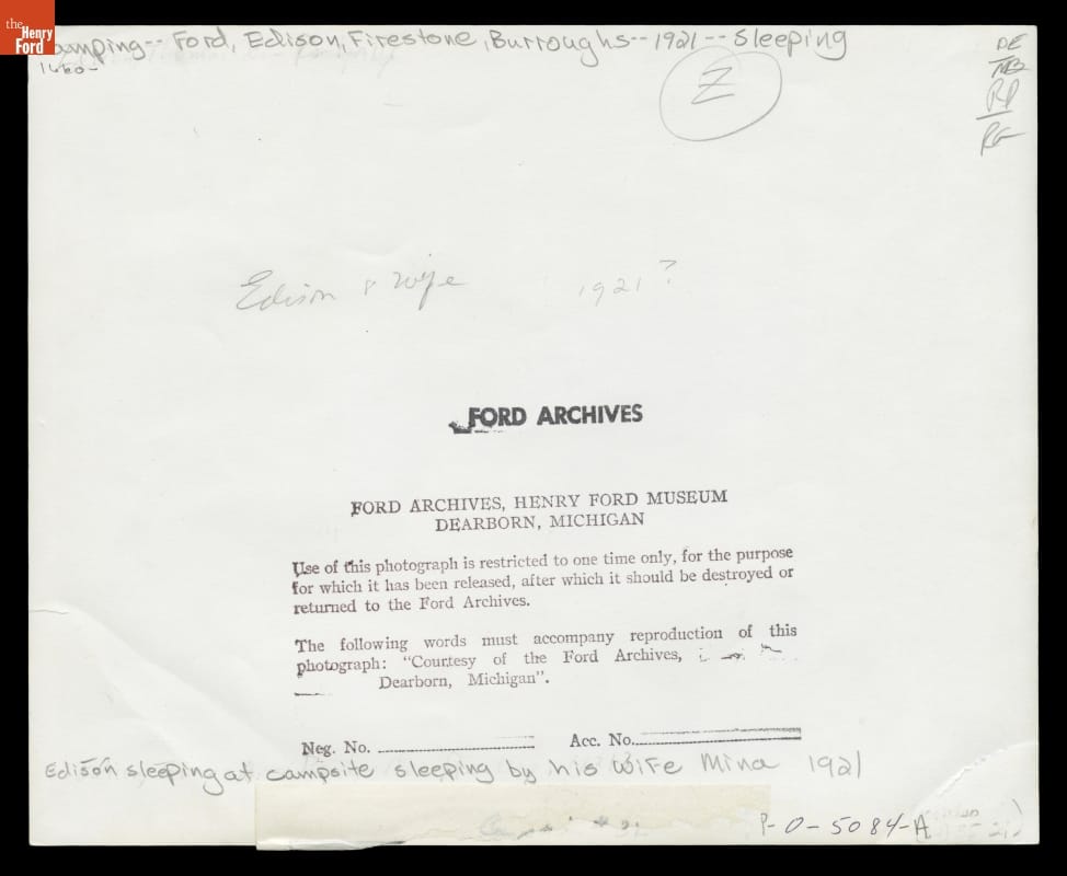 Thomas Edison and Mina Edison at a "Vagabonds" Campsite, 1921