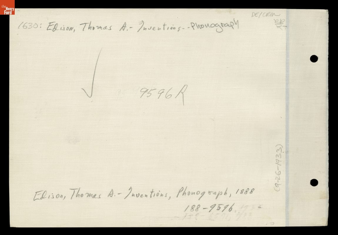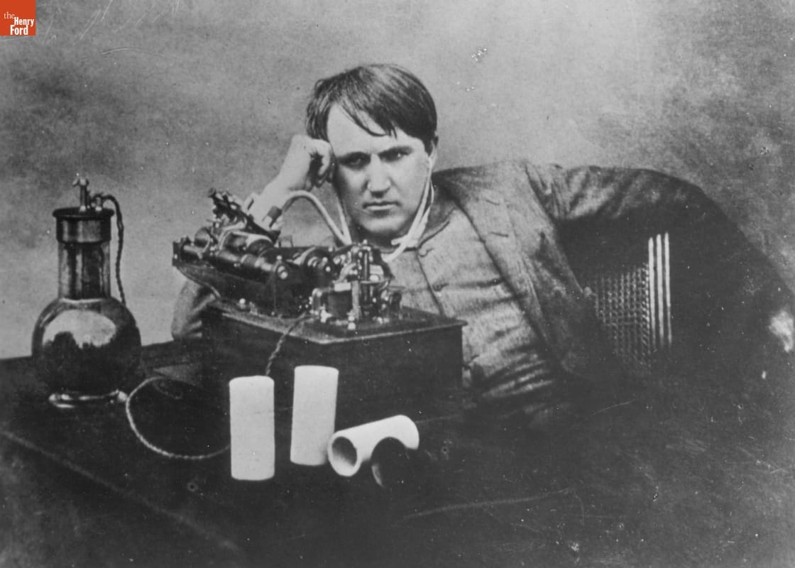 Throughout his life, Thomas Edison continued to develop the phonograph he had invented in 1877. On June 11, 1888, Edison launched a round-the-clock session with his assistants to perfect the phonograph. When he emerged from his West Orange, New Jersey, laboratory days later, the exhausted, slumping inventor posed for this photograph with his improved machine.