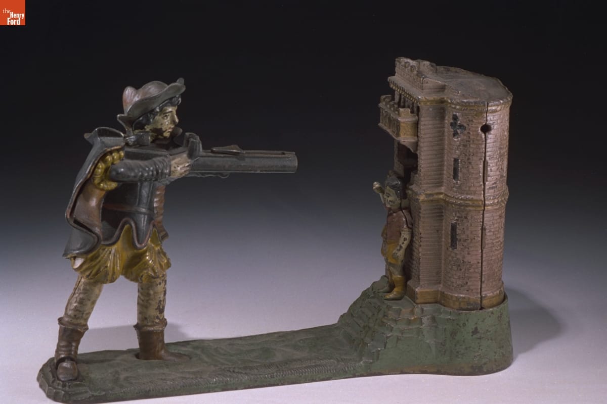 When William Tell's right foot is pressed, the coin shoots into the castle, knocking the apple off the boy's head. The bank is based on the legendary story of the Swiss patriot who was ordered to shoot an apple off his small son's head.