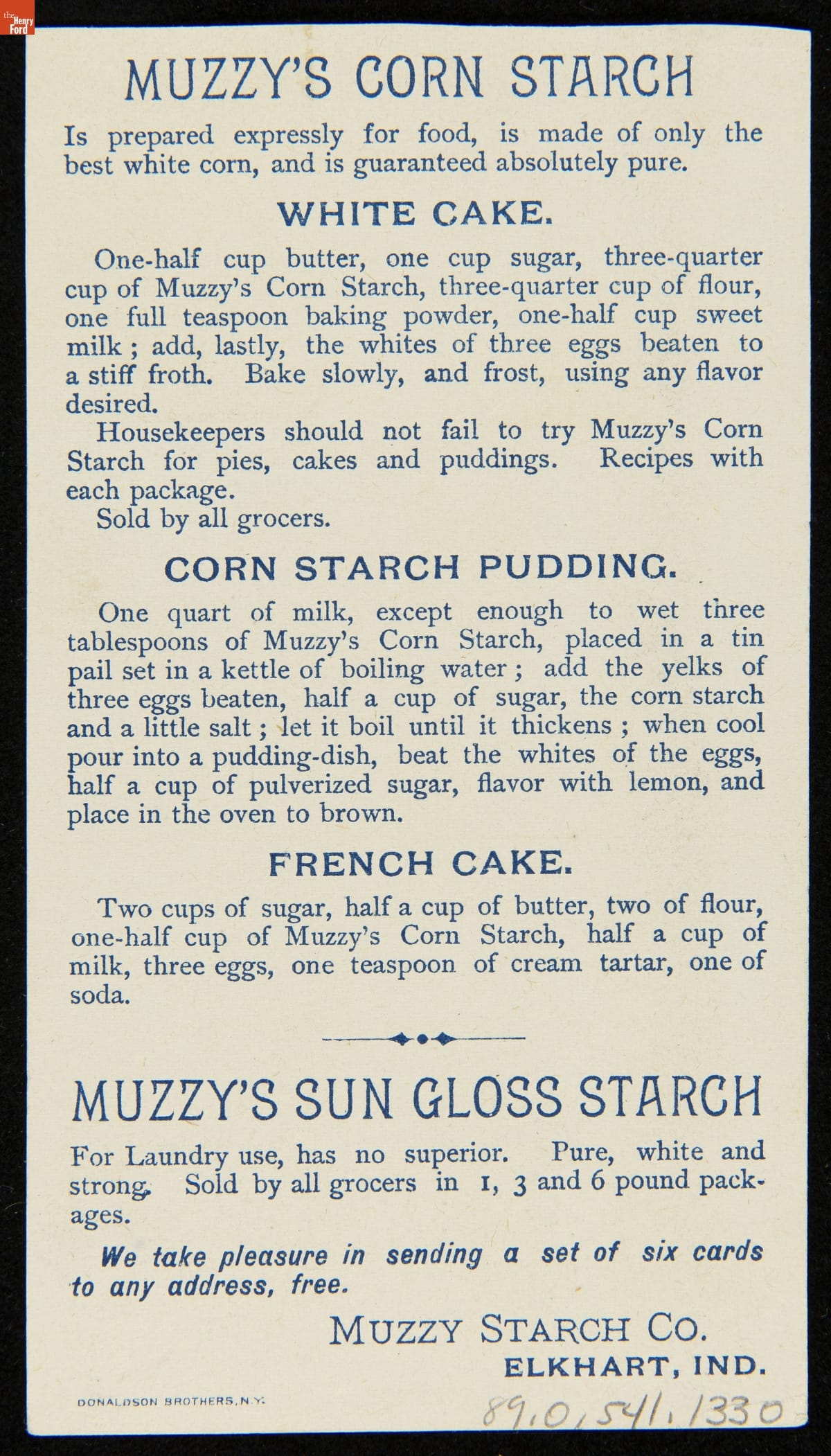 As color printing gained momentum in the late 19th century, trade cards became a major means of advertising goods and services. Americans enjoyed and often saved the little advertisements found in product packages or distributed by local merchants. This trade card advertises Muzzy's Corn Starch.