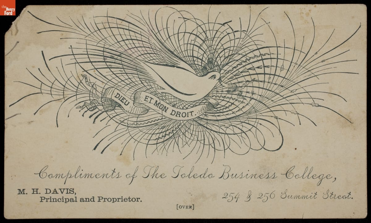 Trade Card for the Toledo Business College, Matthew H. Davis, 1881-1894