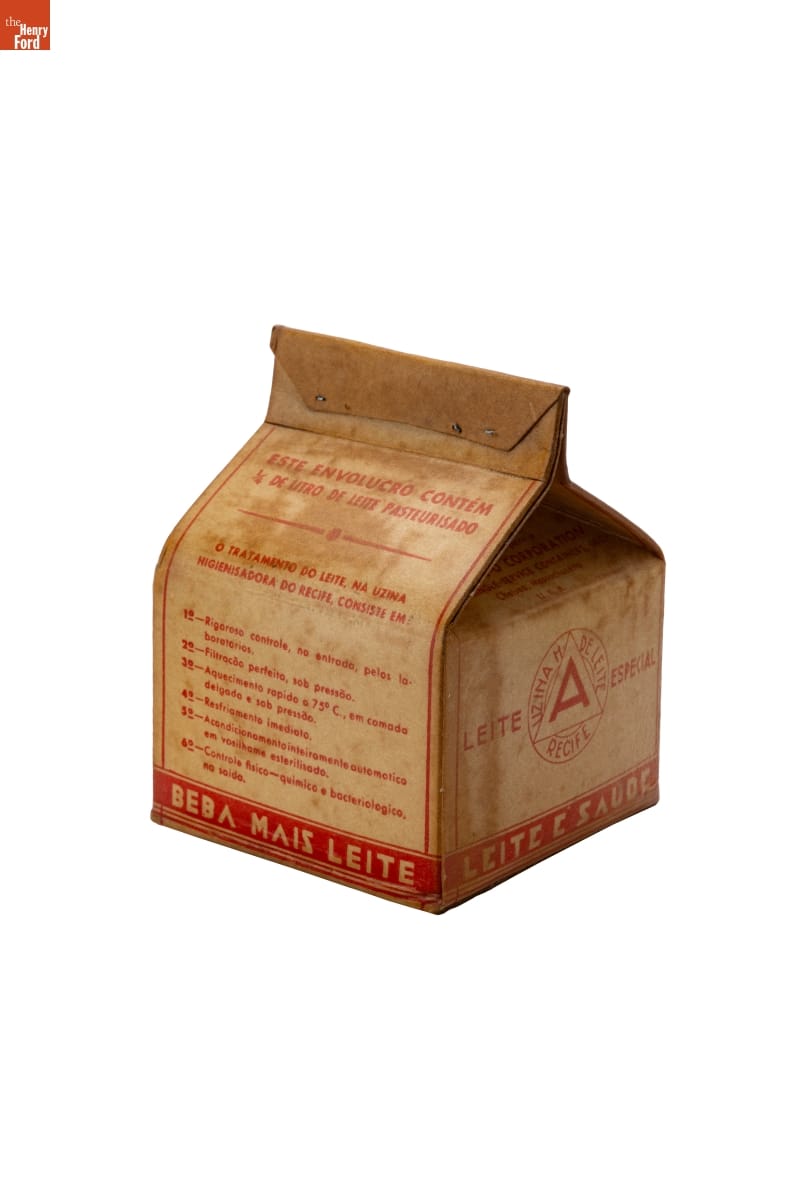The quest for a shatter-proof milk container prompted John Van Wormer to patent a paper carton in 1915. Many processors and distributors continued to use breakable glass bottles, but, after 1937, mechanized production made the disposable, wax-coated folded cartons inexpensive and indispensable liquid containers. The iconic design, a box with a gable-end top with a pouring or drinking spout, remains the industry standard today.