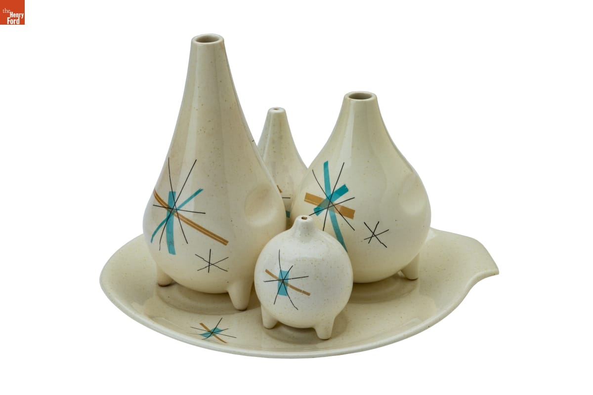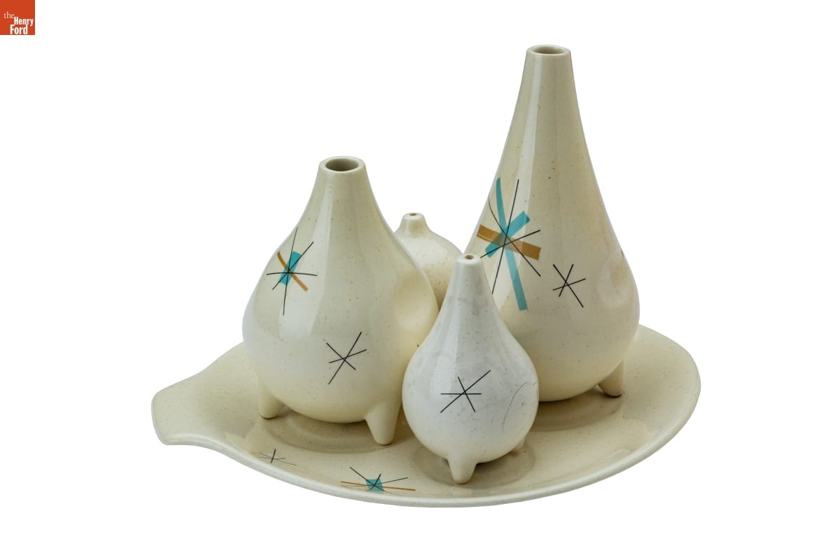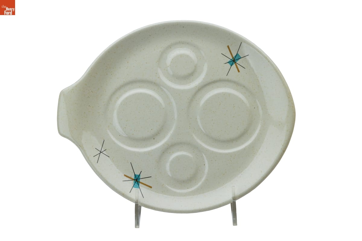 Industrial designer Vicktor Schreckengost (1906-2008) began working for the Ohio-based Salem China Company in the 1930s after graduating from the Cleveland School of the Arts. Schreckengost created new and distinctive shapes and patterns for the company, including this "Hopscotch" pattern in the 1950s. The company later simplified and renamed it "North Star," a pattern that became emblematic of middle-class tastes of the 1950s and 1960s.