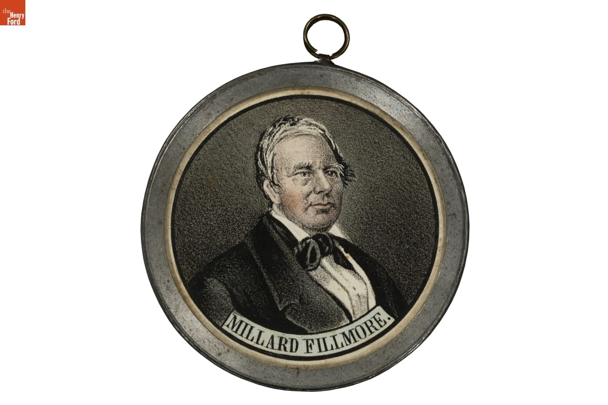 This medallion holds prints of Zachary Taylor and Millard Fillmore, candidates on the 1848 Whig Party presidential ticket. Even though he had never divulged his political leanings, Whigs in the North and South found reasons to back Taylor, a hero of the Mexican-American War. Taylor eventually declared that he was a Whig and defeated Democrat Lewis Cass and Free Soil candidate Martin Van Buren.