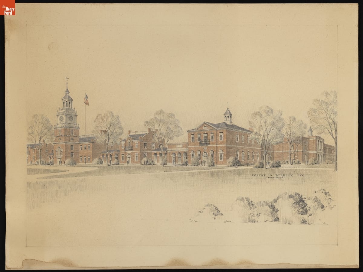 This is one of three color perspective renderings of the proposed Museum building presented to Henry Ford by architect Robert O. Derrick. This worm's eye view shows the front façade from the southeast perspective. The focal point is a full-scale replica of Independence Hall in Philadelphia, which appears on the left side. Although altered, much of this design was completed.