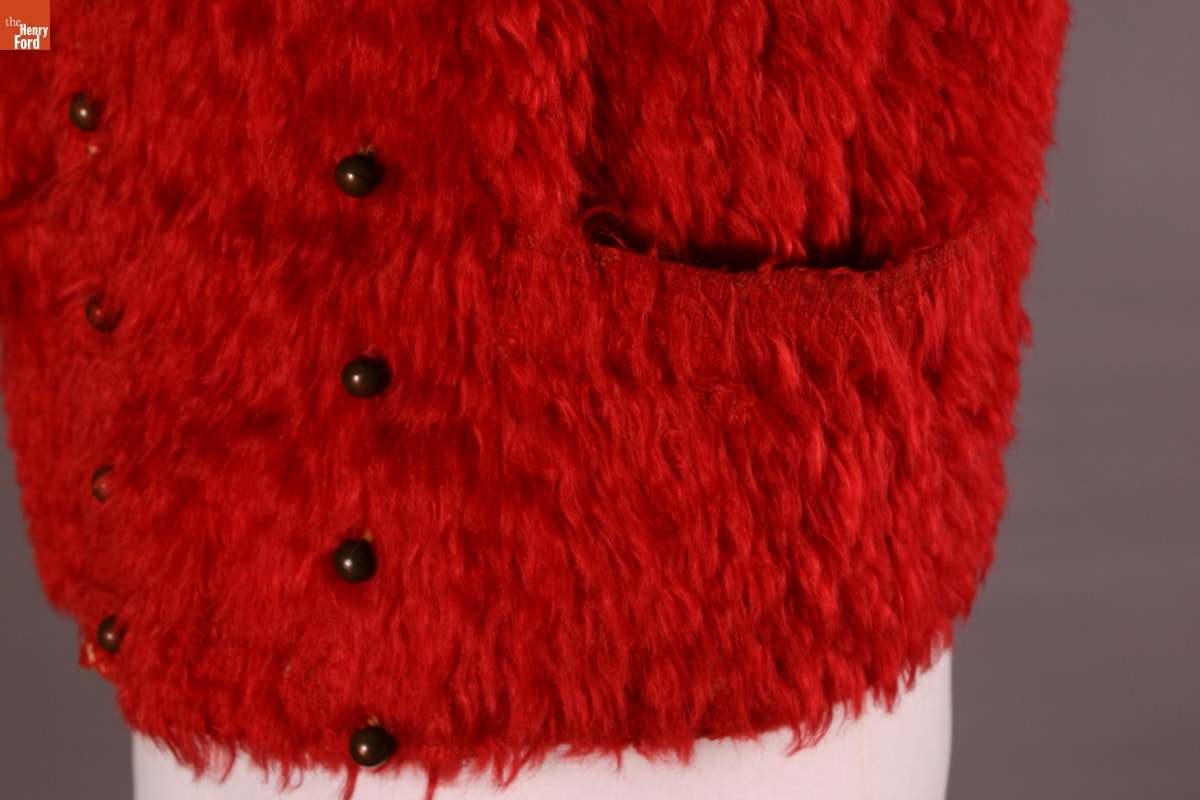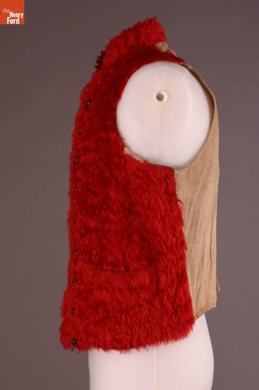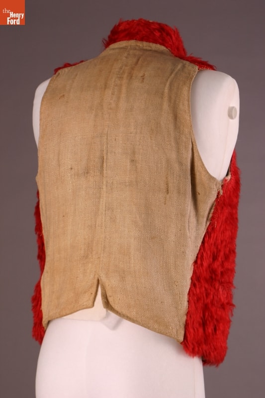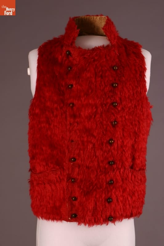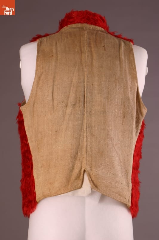Inspired by French fashion, men of turn-of-the-nineteenth-century America padded their chests with layers of clothing. To achieve the stylish large-chested look, they often donned frilled shirts, puffy neckbands called cravats, at least one waistcoat - or vest - like this, and an overcoat with a very high, stiff collar.