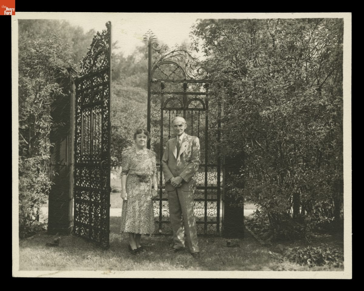 Clara Ford and Henry Ford by the Iron Gate in the English Garden at Fair Lane, Dearborn, Michigan, September 1939