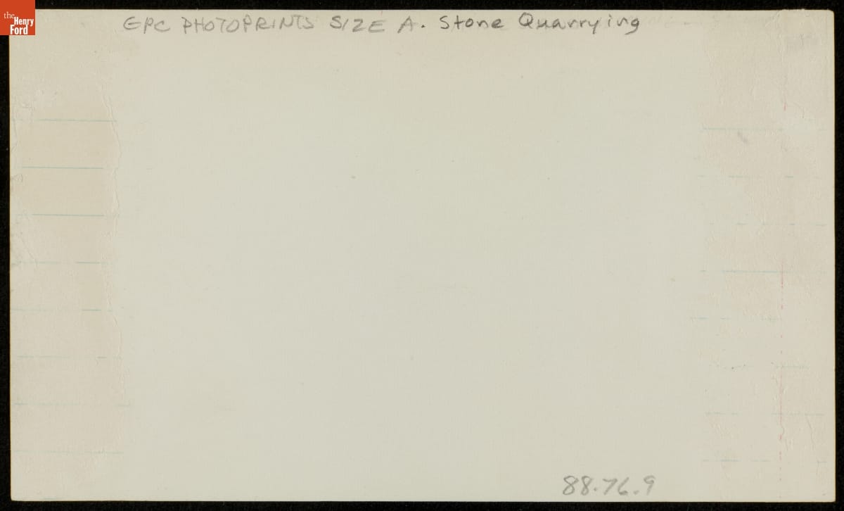 Before it fell, the hoist pictured here would have helped workers lift and transport material taken from this unidentified quarry. The photograph was clipped from a scrapbook owned by Detroit Edison electric utility's Photographic Department. Subjects included quarries, lumbering operations, railroad building, electric power stations, and waterways throughout the state of Michigan.