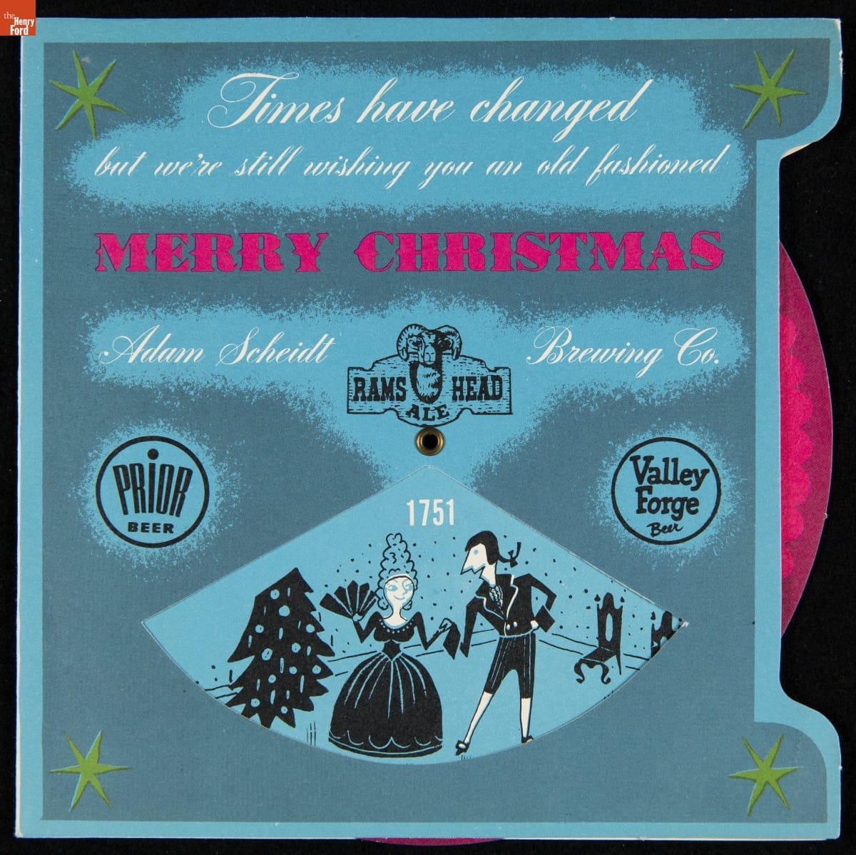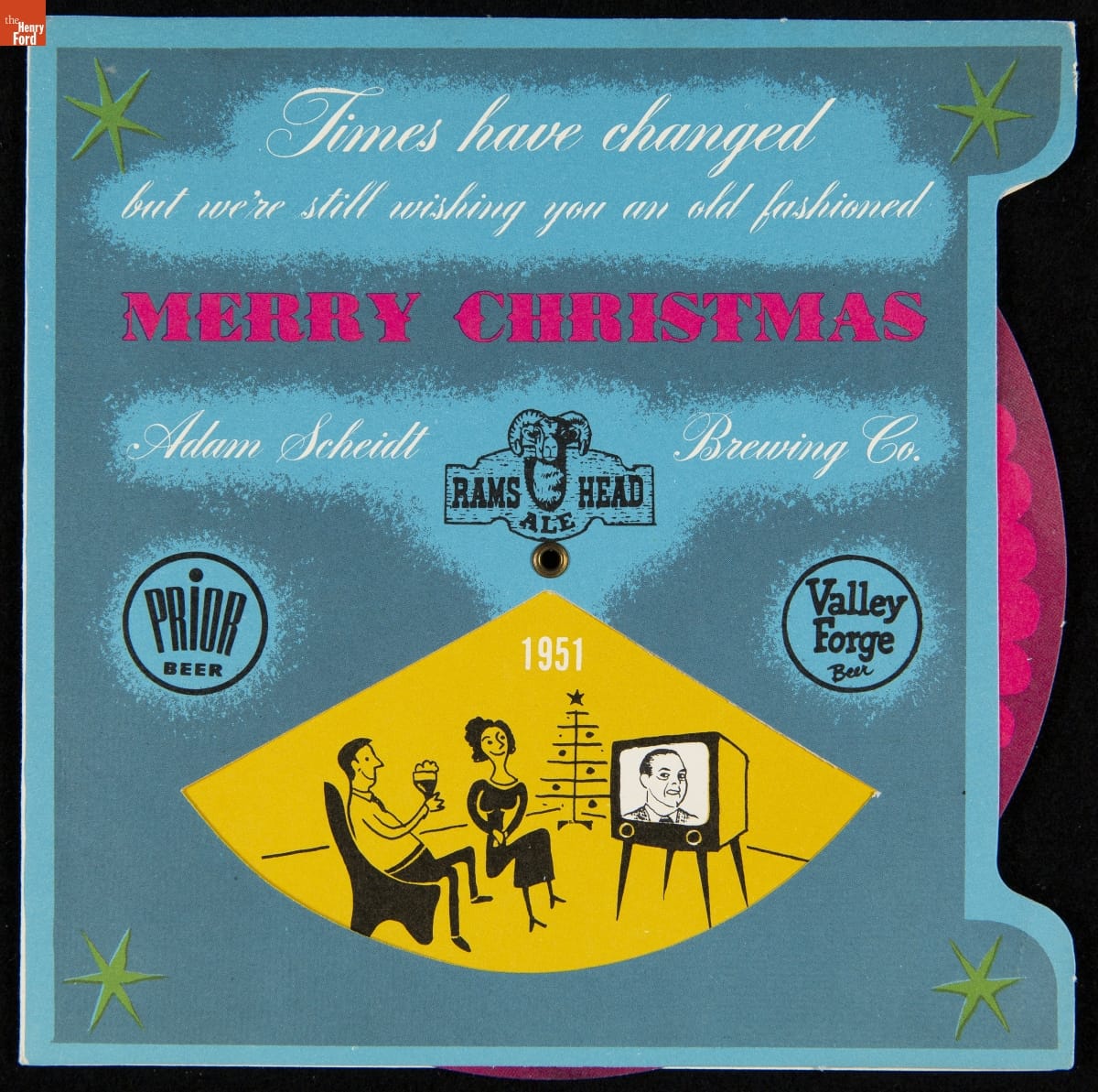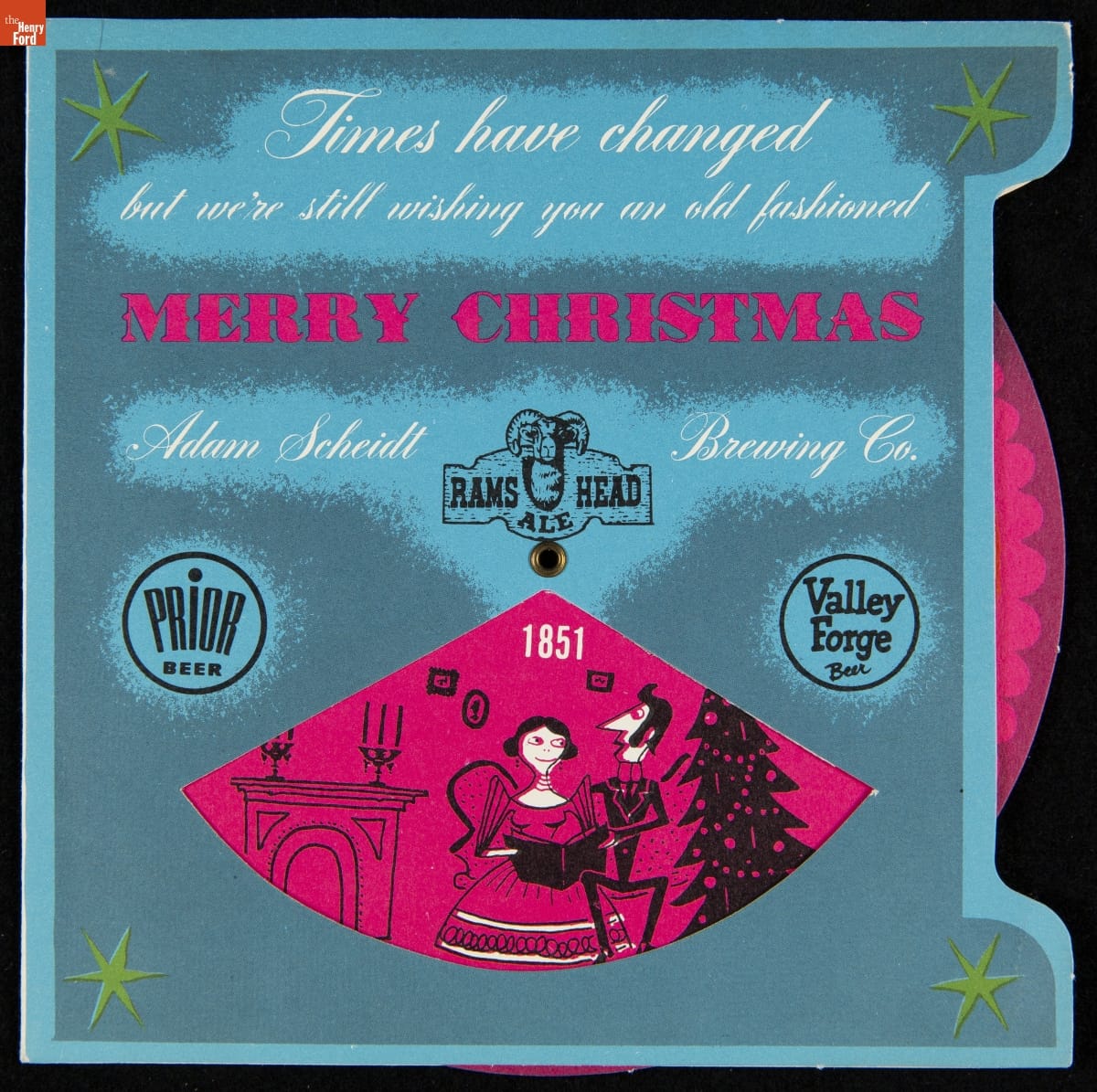 Christmas Card, "Times have changed but we're still wishing you an old fashioned Merry Christmas: Adam Scheidt Brewing Co.," 1951