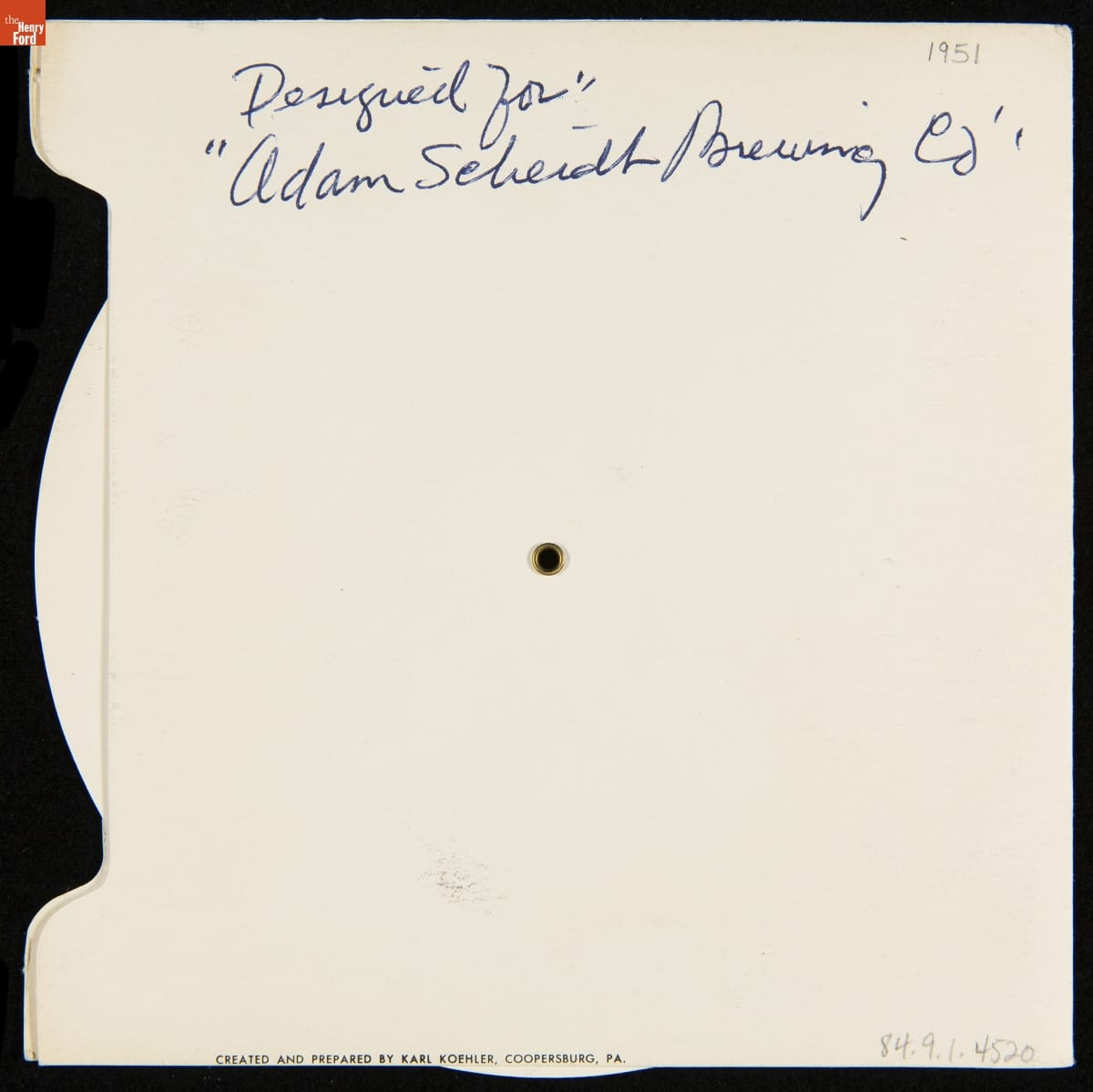 Karl Koehler designed Christmas cards in the late 1940s and 1950s. Many of his cards had pop-up or movable features -- like this card that features a volvelle. A volvelle is a rotating disk that provides information, makes various calculations, or in this case, reveals different images when turned. Koehler created this seasonal greeting for Adam Scheidt Brewing Company of Norristown, Pennsylvania.
