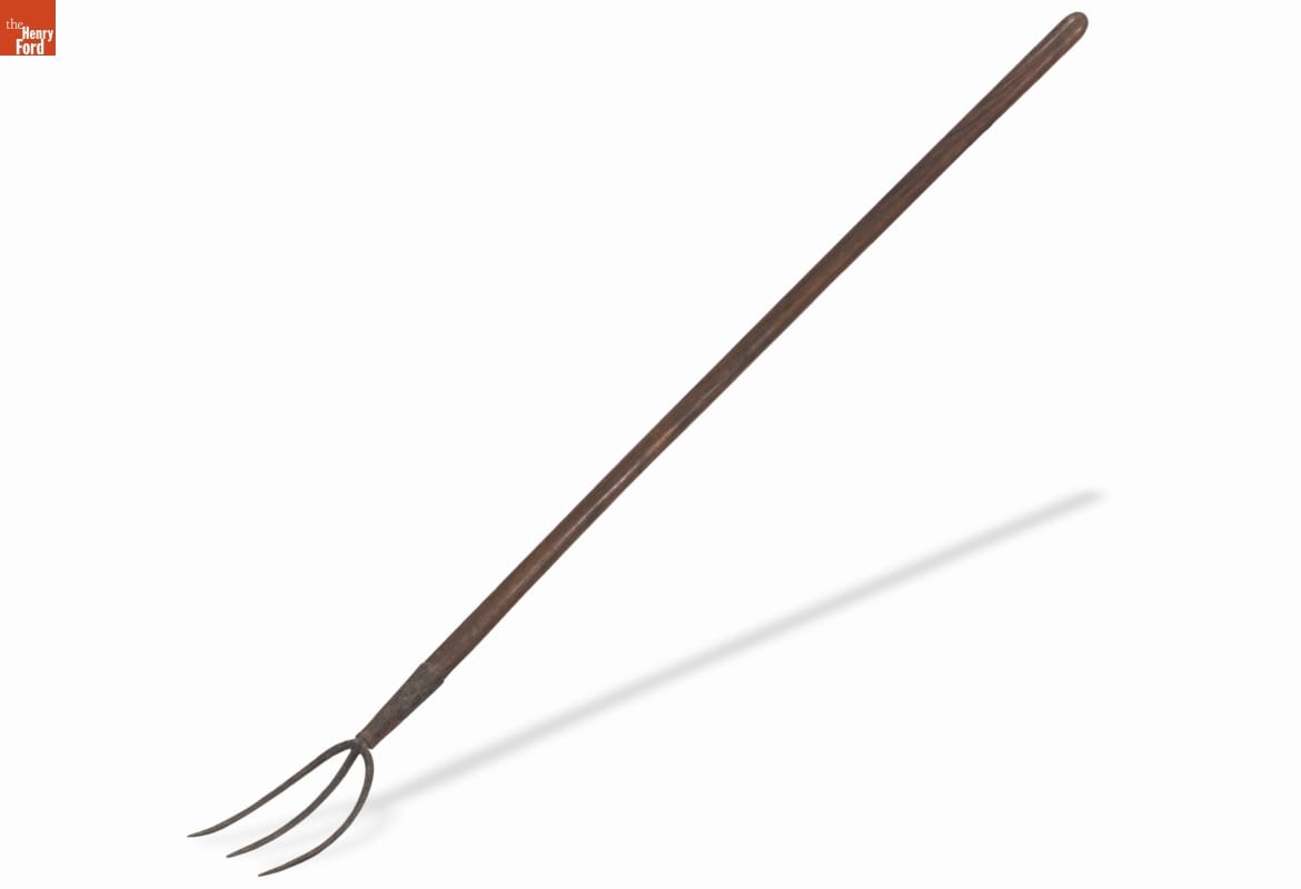Pitchforks worked as extensions of farmers' arms, allowing them to skewer, lift, and move larger quantities of hay, sheaves of grain, or straw than they could do with just their hands. They used different fork designs for different jobs. Two- and three-tine forks like this (with short metal points) worked best to pitch bundles of grain from field to wagon to thresher.