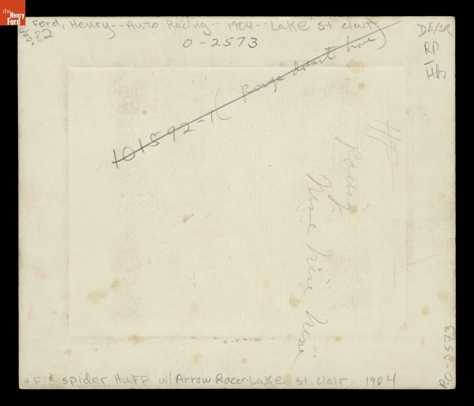 On January 12, 1904, Henry Ford and his riding mechanic Ed "Spider" Huff set a world speed record of 91.37 miles per hour on a frozen Lake St. Clair, northeast of Detroit. The feat raised Ford Motor Company's profile, and the "Arrow" racer -- though referred to as the Ford "999" -- became a common subject in Ford advertisements.