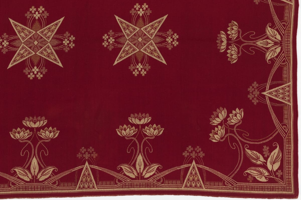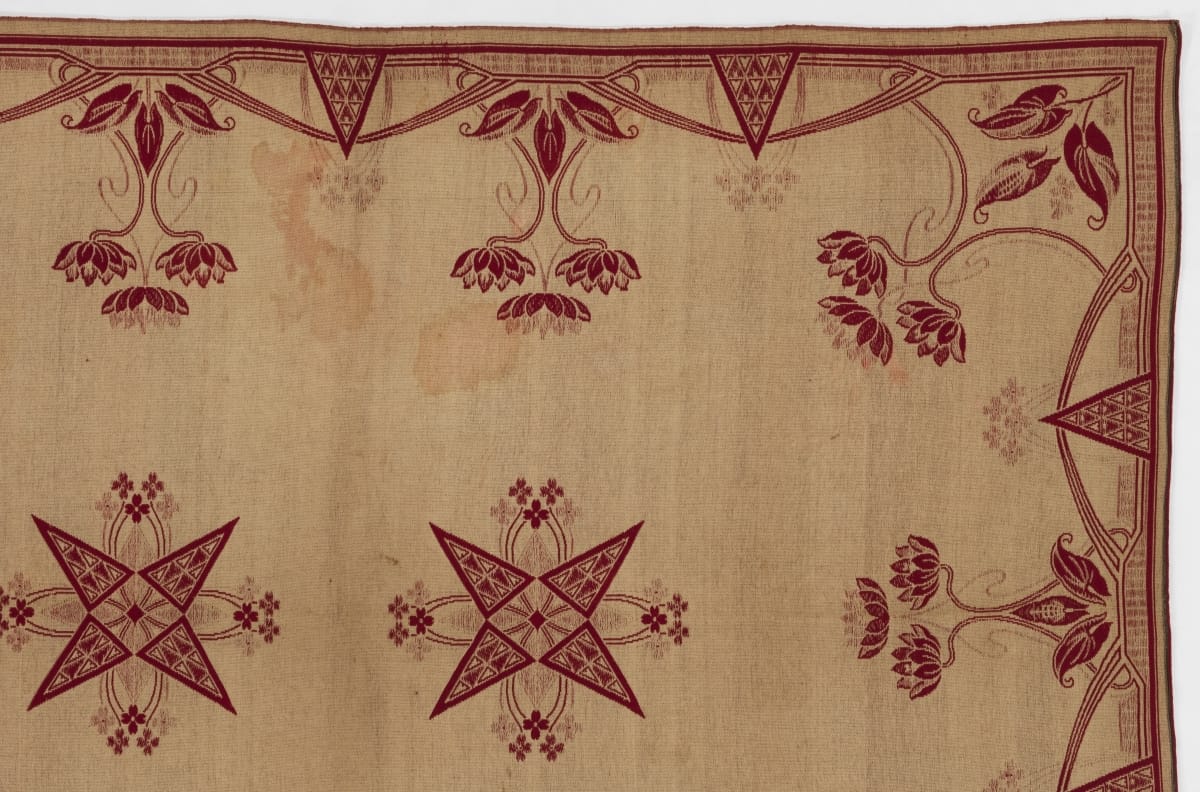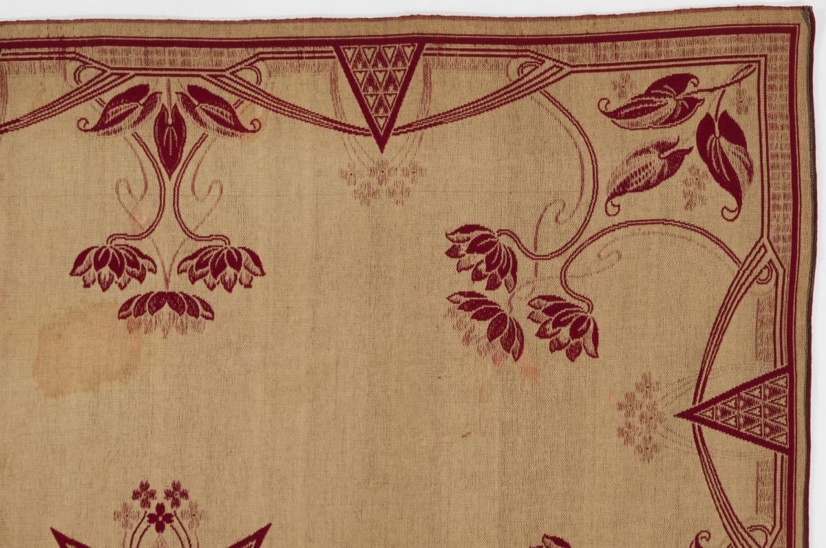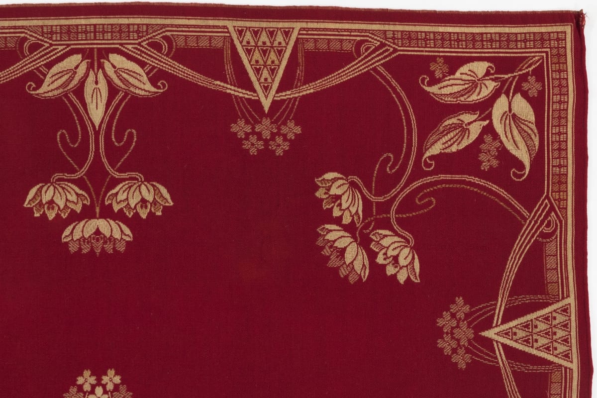 In the 1890s, artists and designers in Europe and the United States attempted to create a modern aesthetic for the 20th century. The decorative style that emerged, Art Nouveau, reached its peak of popularity in 1900. This tablecloth features characteristic elements of Art Nouveau design: bold color contrasts, undulating "whiplash" lines, and stylized botanical motifs.
