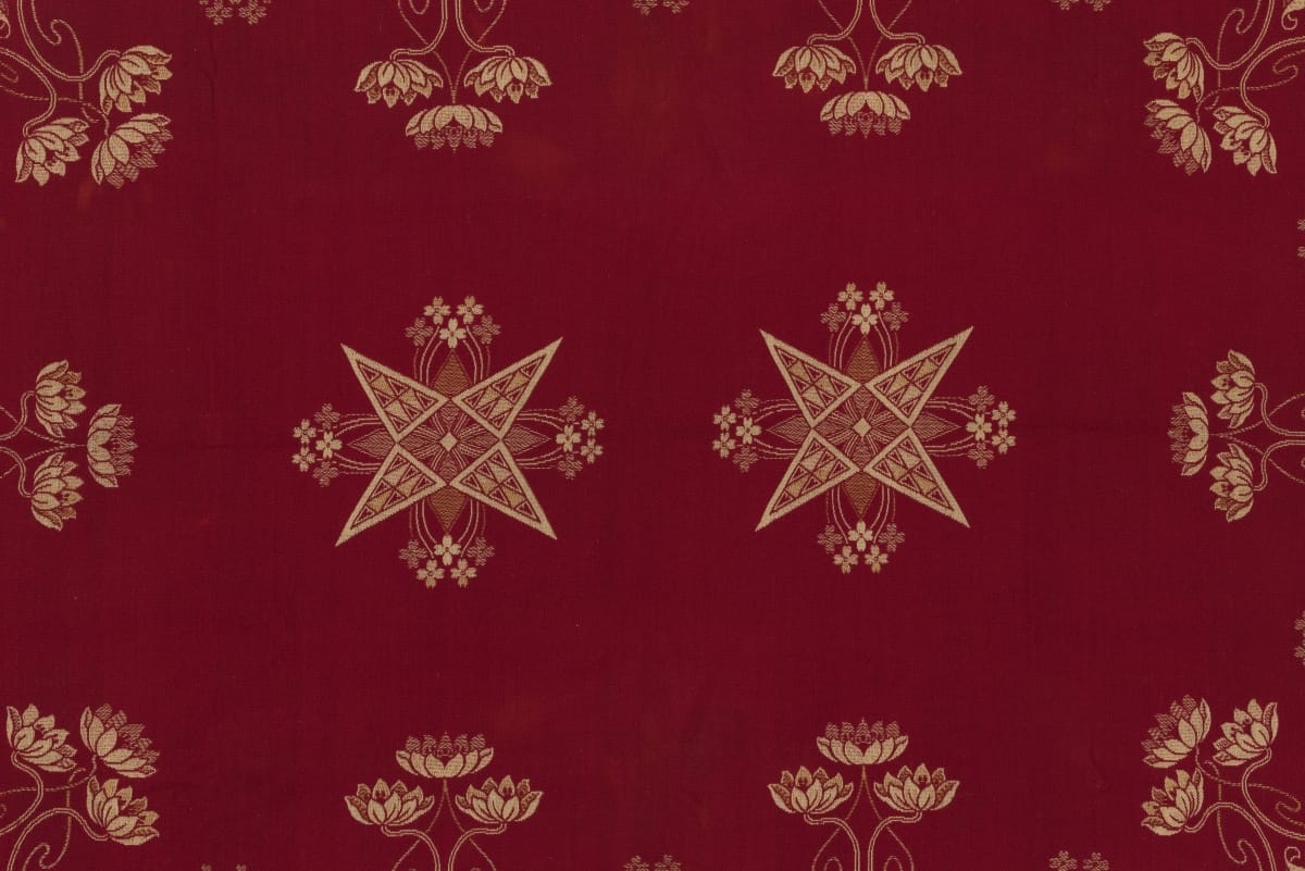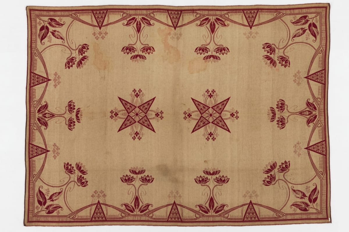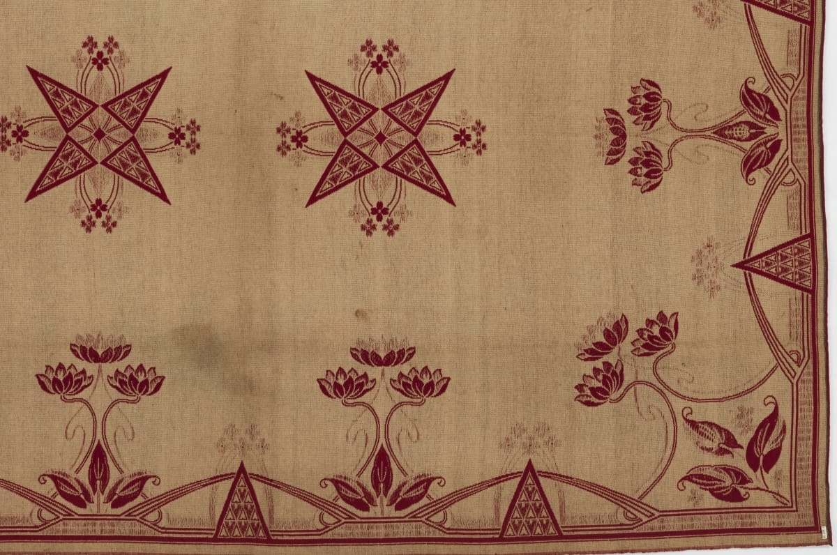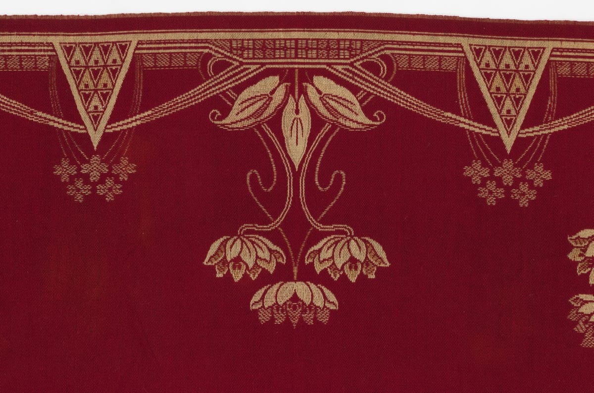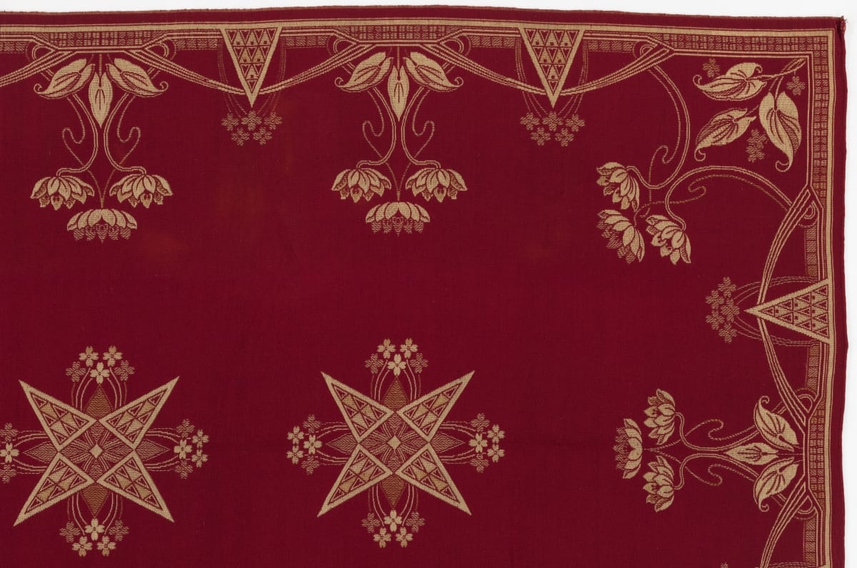 In the 1890s, artists and designers in Europe and the United States attempted to create a modern aesthetic for the 20th century. The decorative style that emerged, Art Nouveau, reached its peak of popularity in 1900. This tablecloth features characteristic elements of Art Nouveau design: bold color contrasts, undulating "whiplash" lines, and stylized botanical motifs.