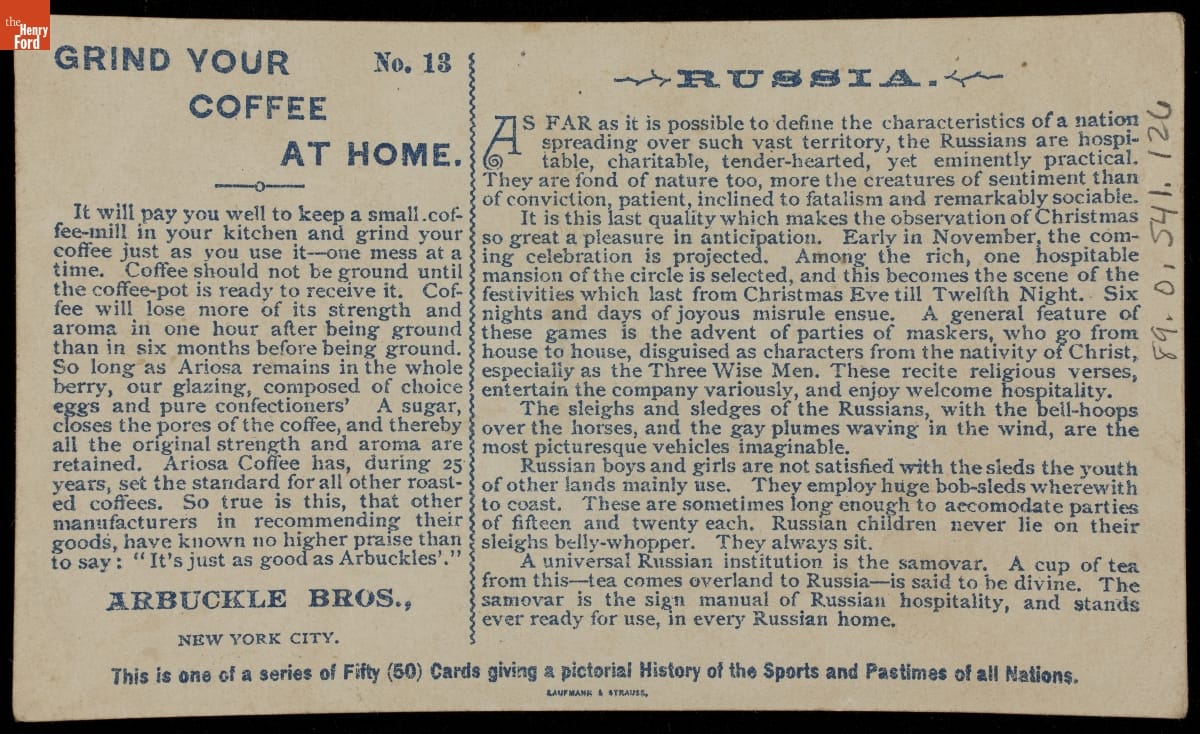 Grocers sold coffee in bulk when John and Charles Arbuckle came up with an innovative process for individually packaging different grades of coffee. Their popular Ariosa coffee beans were glazed with a sugar and egg coating supposedly to improve quality and flavor. This trade card, from the Chicago Columbian Exposition, was in a series depicting different nations' sports and pastimes.