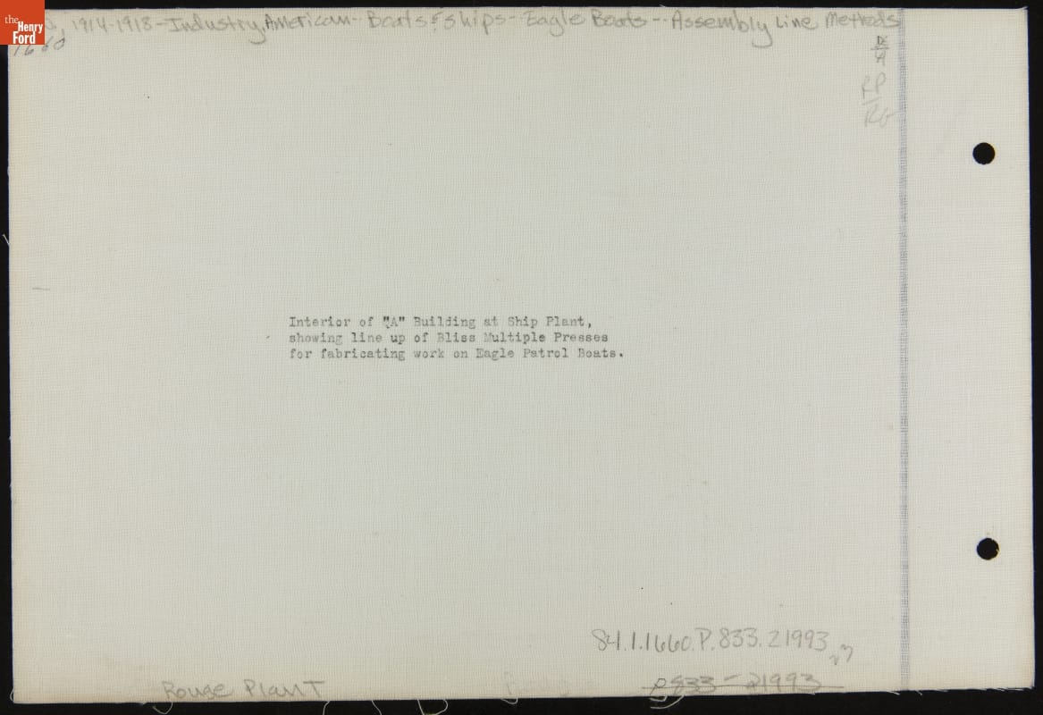 Ford Motor Company built Eagle anti-submarine boats for the U.S. Navy during World War I. Ford assembled the boats, using mass production techniques, at a new plant near the mouth of the Rouge River. The factory consisted of three primary buildings. The "A" Building was where steel sheets were cut to size and punched in preparation for riveting.