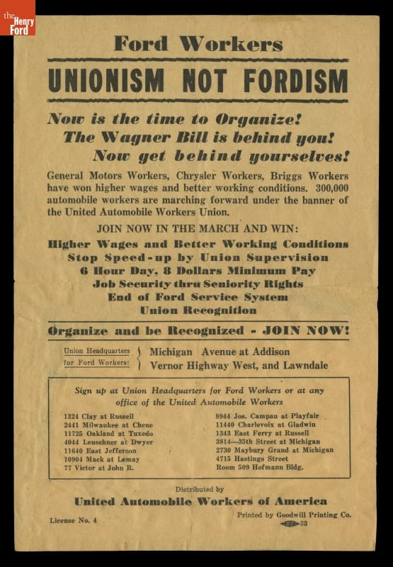 This broadside refers to the 1935 Wagner Act, which guaranteed workers the right to organize unions, and to strike, boycott and picket their employers. The United Auto Workers (UAW) labor union, founded 1935, succeeded in unionizing General Motors and Chrysler within two years. The UAW's next target became Ford Motor Company, which had long resisted unionization. It ultimately succeeded in 1941.