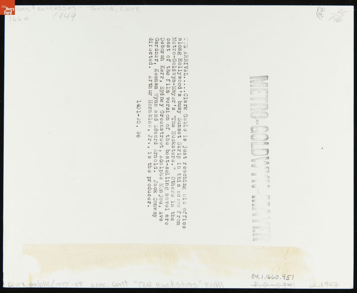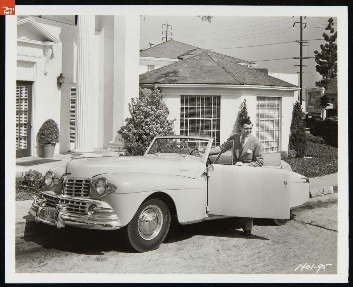 Actor Clark Gable posed with a Lincoln Continental used in his 1947 film The Hucksters. Automakers were always happy to have one of their cars featured prominently in a hit movie. It was terrific advertising and, before television, the only kind of mass media ad that could show a car in motion.