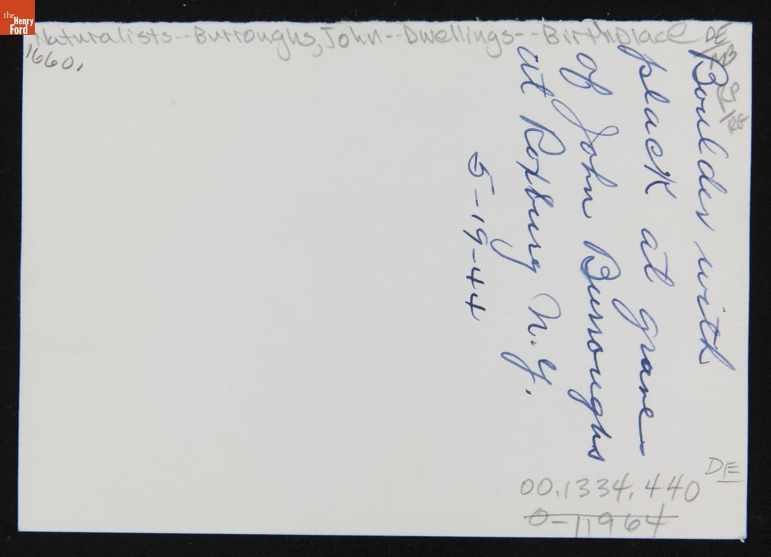 Naturalist John Burroughs (1837-1921) was buried on a quiet plot of ground near his boyhood home in the Catskill Mountains of New York. A plaque was placed on Boyhood Rock where the young Burroughs once played and which now serves as his gravestone. The plaque contains a bas relief of Burroughs and a quote from his poem "Waiting."