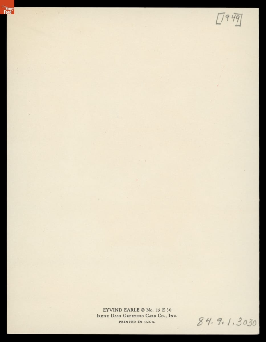 The artist Eyvind Earle (1916-2000) is best known for his work on the 1959 Walt Disney Studios animated film Sleeping Beauty, but he also designed Christmas cards. Earle began producing cards in his early twenties, selling them through his own company. Later, Earle joined the American Artists Group and continued designing Christmas cards. He would produce more than 800 designs throughout his career.