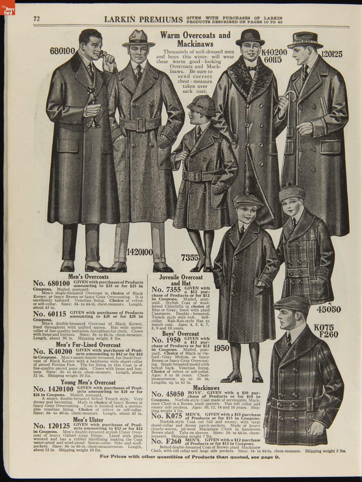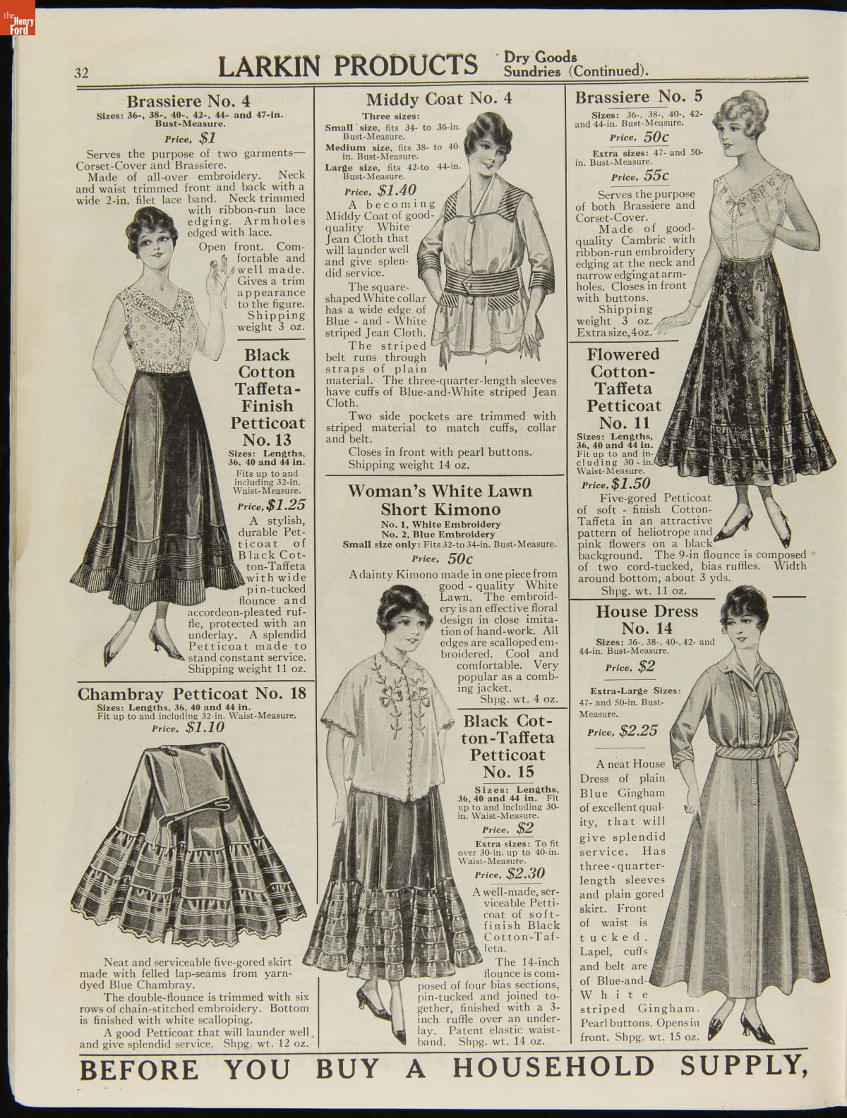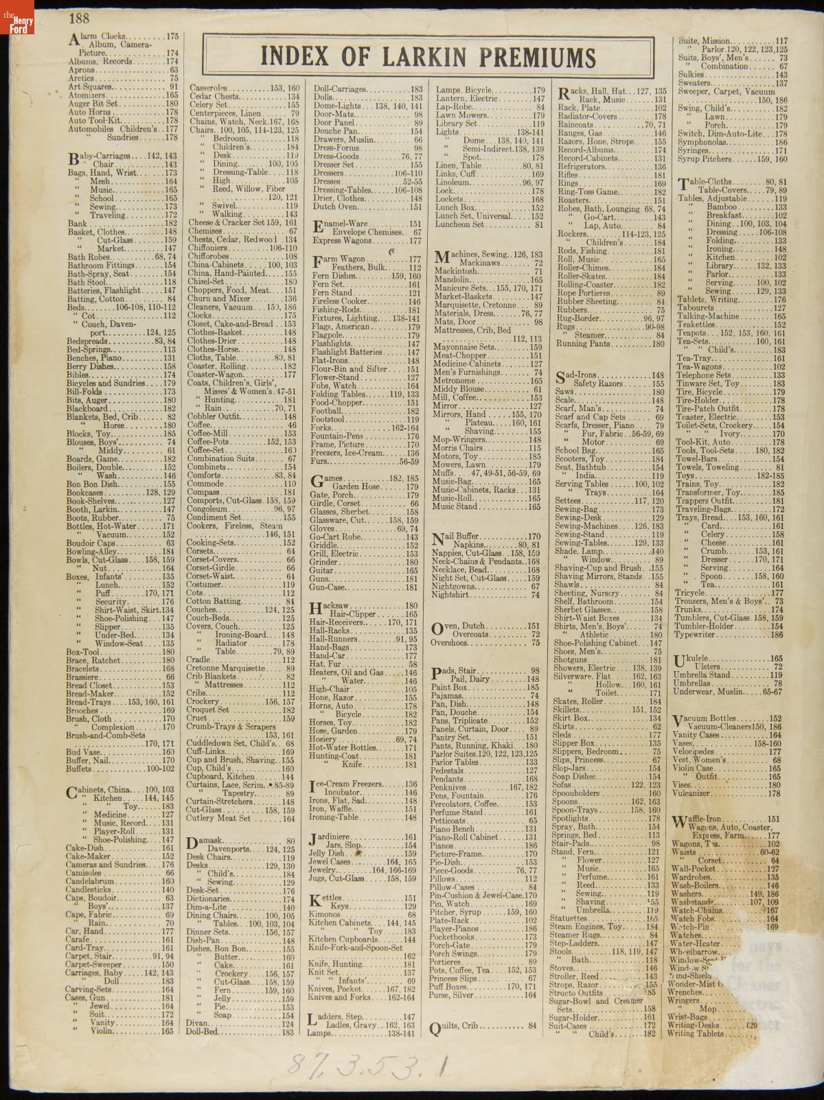 John D. Larkin established a soap manufacturing company in 1875. He hired his brother-in-law, Elbert Hubbard, as a salesman. Hubbard developed "The Larkin Idea," a plan that sold goods directly to consumers through mail-order catalogs and offered incentivizing giveaways. It was a success. By the early 1900s, Larkin's catalogs contained pages of products and even more pages of premiums from which customers could choose.
