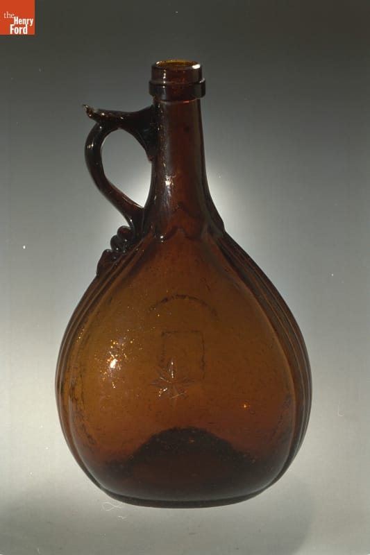 Glass factories in America began producing inexpensive, mold-formed flasks in the early 1800s. These figured flasks, often decorated with symbols of national pride, appealed to America's common man. This calabash -- a gourd-like form popular in the mid-19th century -- contains an image of a sheaf of grain. This symbol of agriculture also may allude to the flask's content of grain-based alcohol.