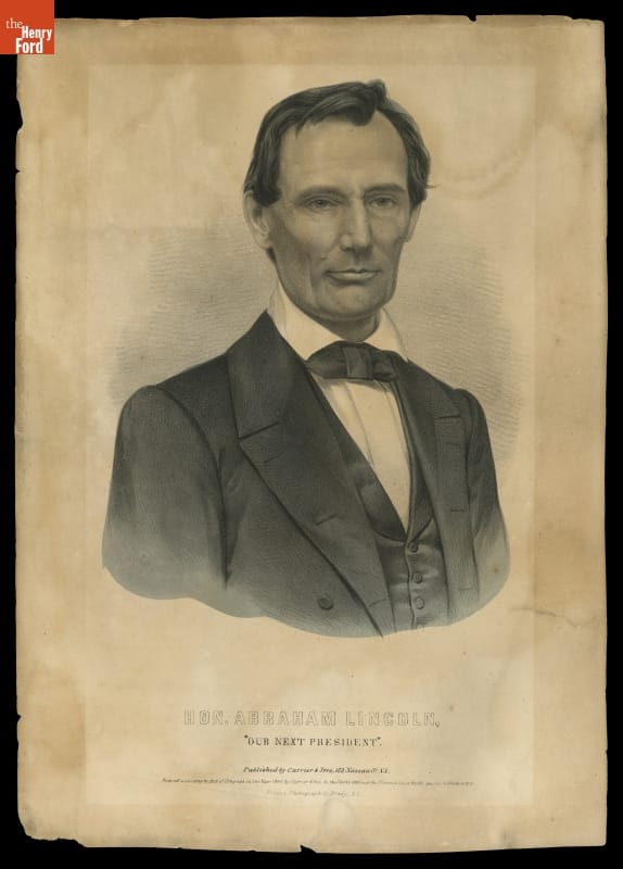 This lithograph portrait of President-elect Abraham Lincoln was based on a photograph taken by Mathew B. Brady on February 27, 1860. Lincoln had been in New York City to give a speech at Cooper Union. He is depicted beardless as he was during the election campaign. By the time he traveled to Washington, D.C., for his inauguration on March 4, 1861, he had grown a full beard.