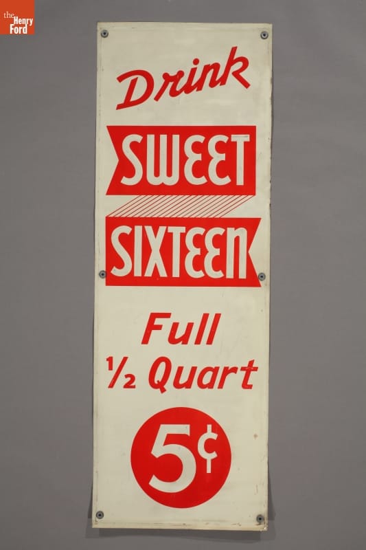 Before the days of national brands, locally-made products were advertised in community newspapers, through free giveaways, and by signs like this one -- that were affixed to the front and side walls of stores. The Mathews Company of Detroit, who produced this sign, specialized in the production of metal signs that advertised local products like Detroit-based Sweet Sixteen soda.