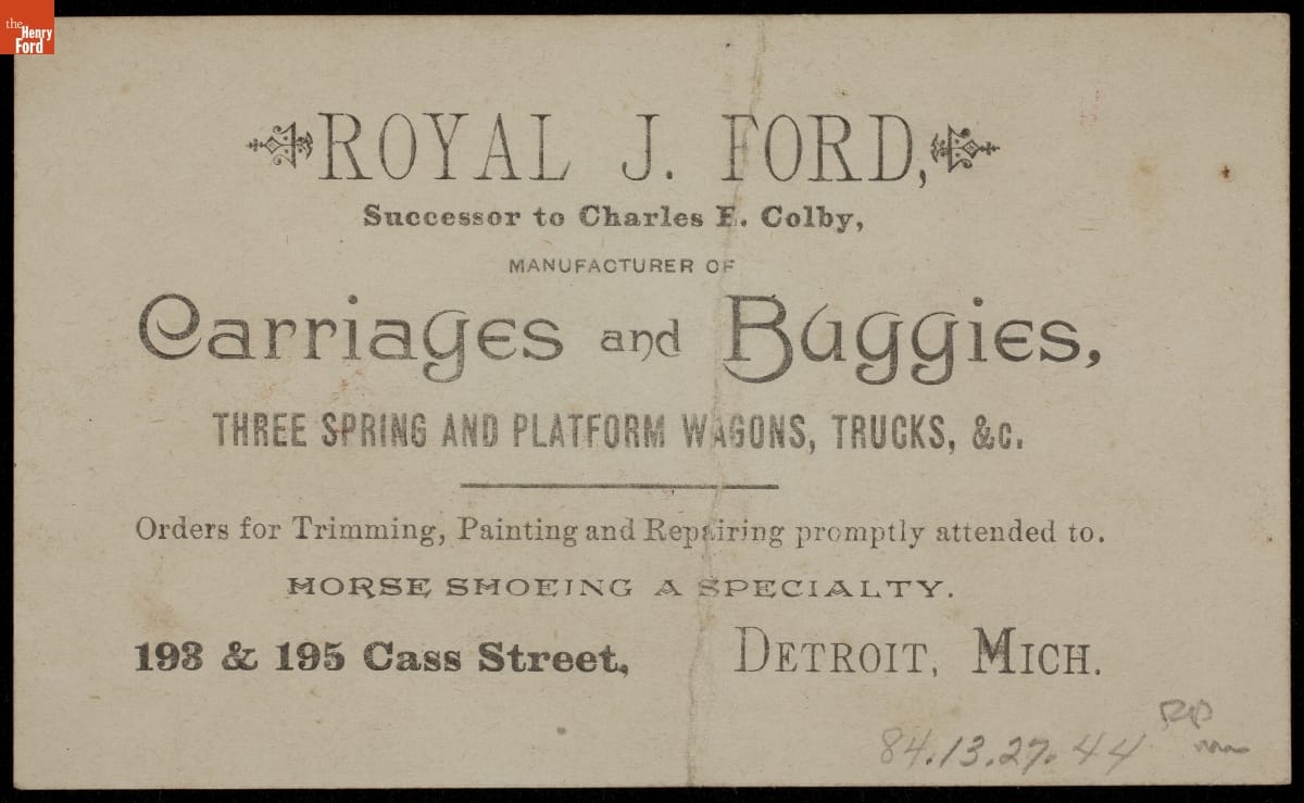Trade Card for Carriages and Buggies, Royal J. Ford, circa 1891