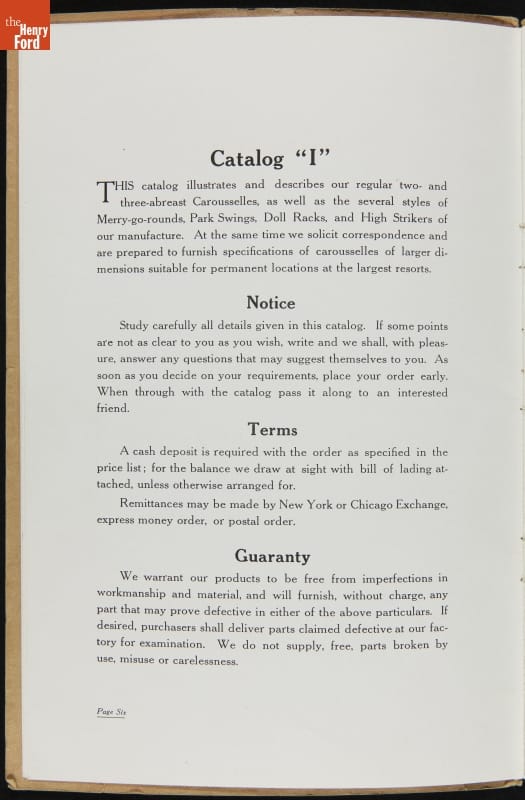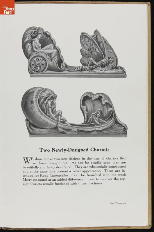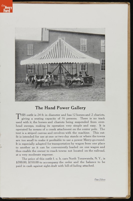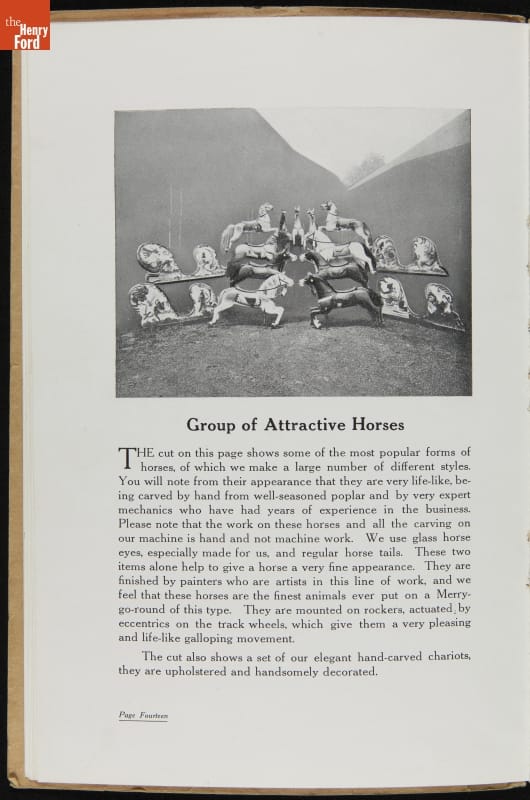 This catalog highlights the products of Herschell-Spillman Company, from portable merry-go-rounds to large stationary "carousselles." This company, one of the most popular and successful American carousel manufacturers of the early 20th century, combined a method of shop production to produce carved wooden animals with their expertise in steam engines and boilers for efficient operation of their merry-go-rounds and carousels.