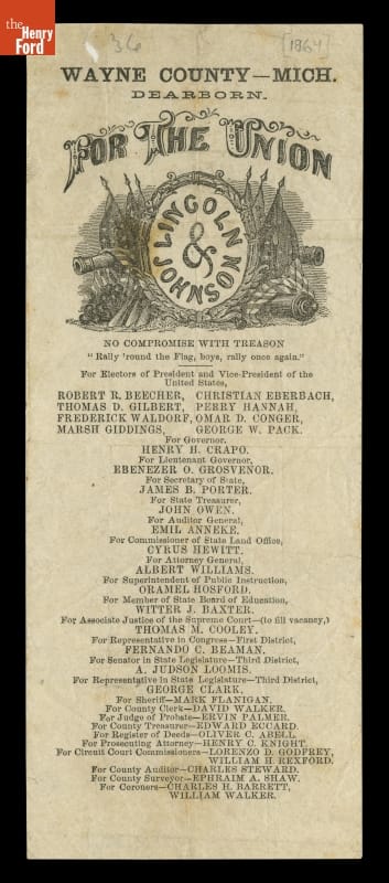 1864 Presidential Election Ballot with Union Party Ticket for Dearborn, Michigan