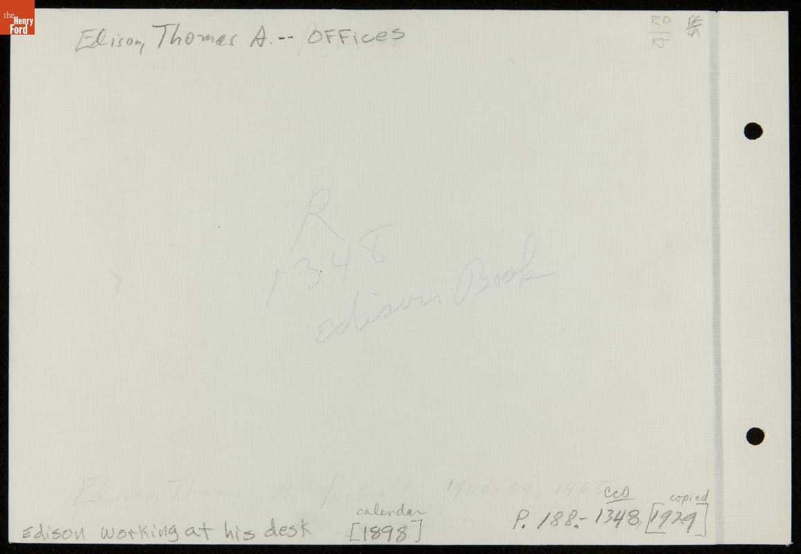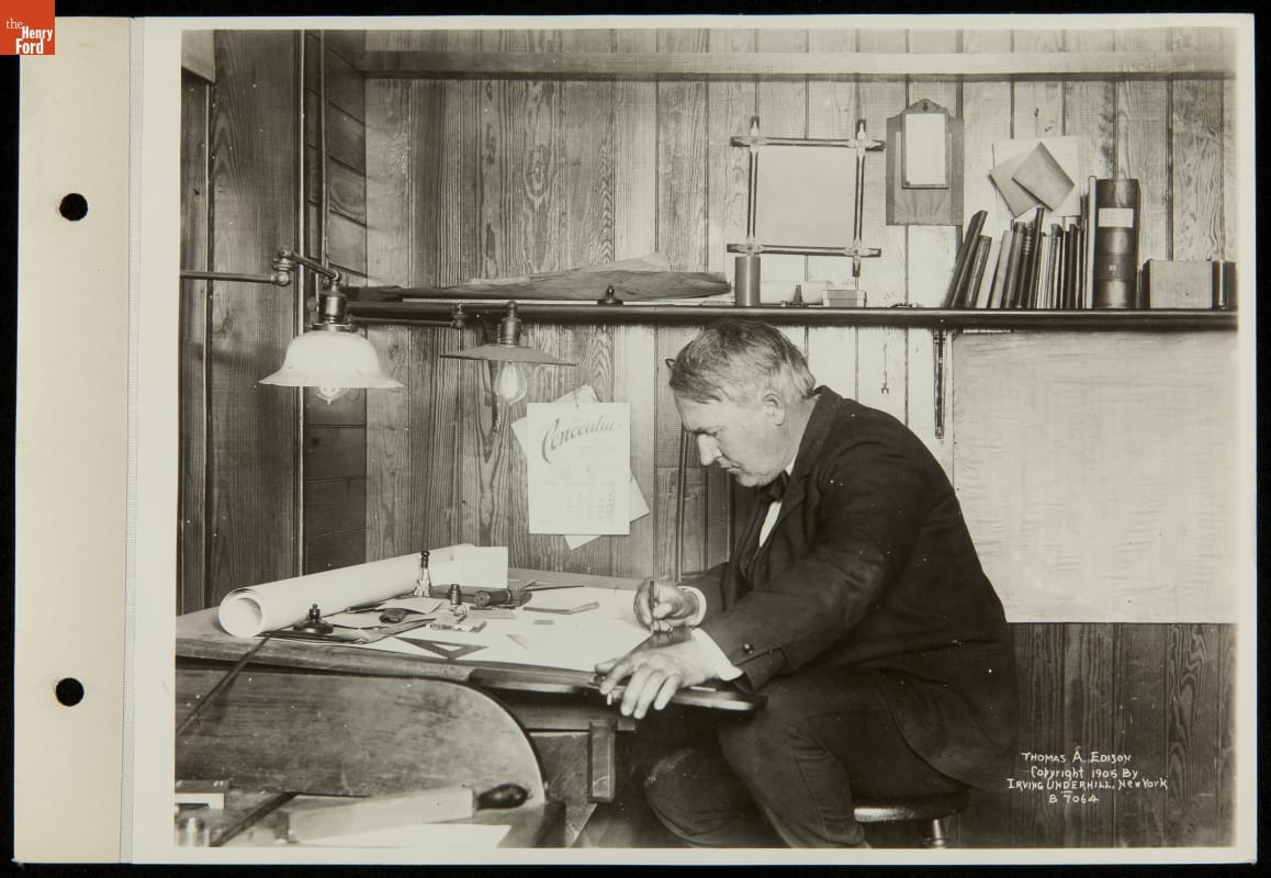 This photograph shows inventor Thomas Alva Edison at work in his West Orange, New Jersey, laboratory. Edison directed teams of research assistants here for nearly fifty years -- from 1887 until his death in 1931. More than half of Edison's 1,093 patents resulted from the collaborative work done in this complex, which became a model for modern research and development laboratories.