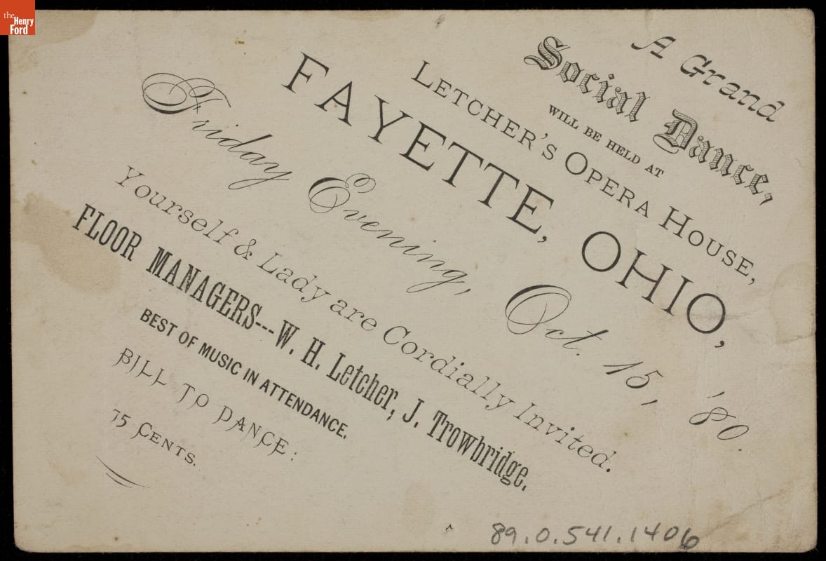 Trade Card Advertising a Social Dance, Letcher's Opera House, Fayette, Ohio, 1880