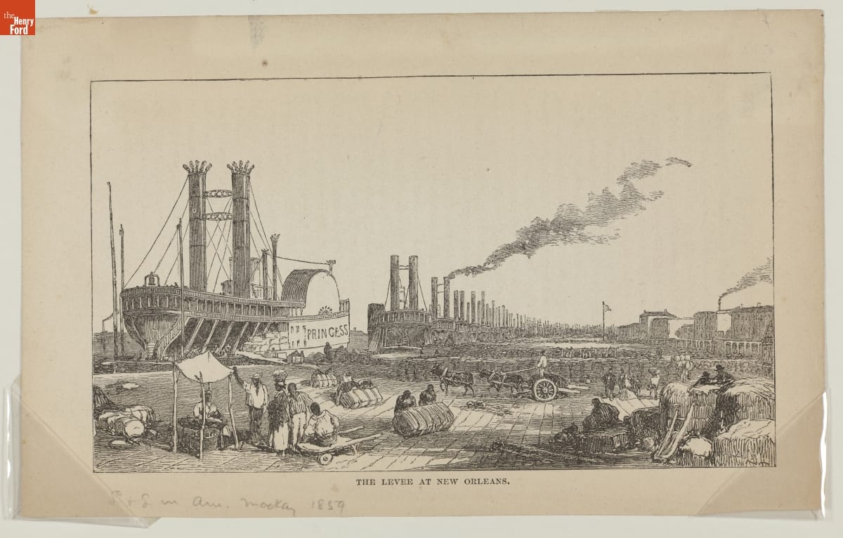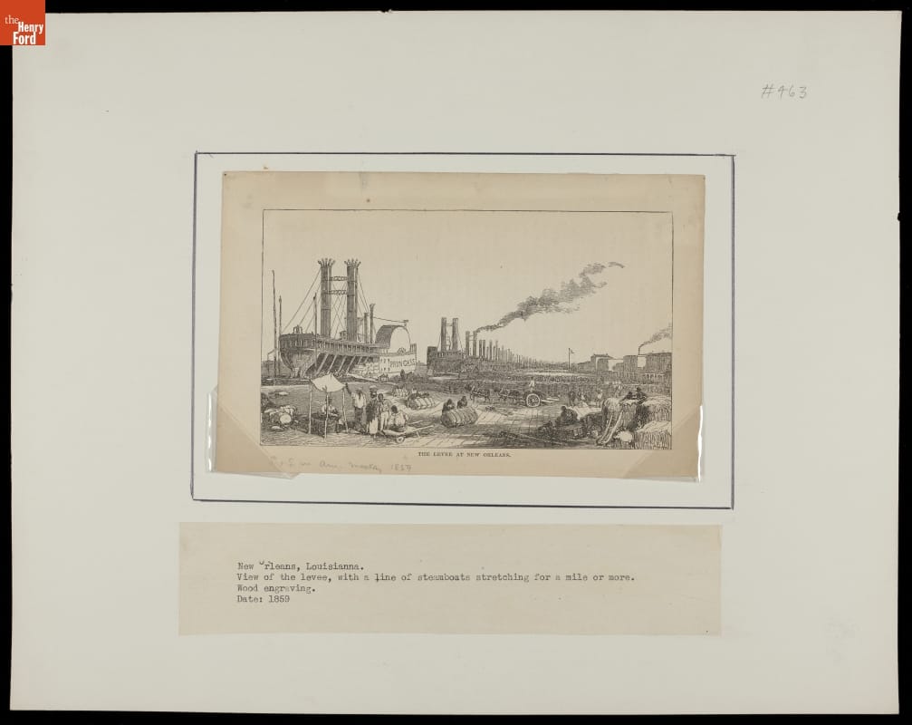 Description beneath: New Orleans, Louisiana. View of the levee, with a line of steamboats stretching for a mile or more. Wood engraving. Date: 1859 (River is the Mississippi)
