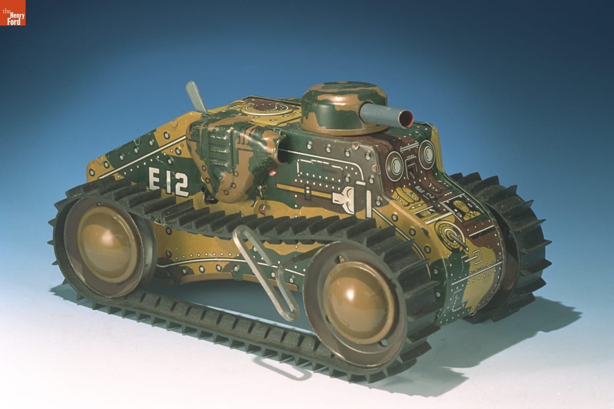 A key-wound spring mechanism lets the tank climb hills and causes it to fire sparks. After working for Ferdinand Strauss, Louis Marx started his own business in 1919. He revolutionized the toy business by manufacturing high-quality and appealing toys at a lower price than his competitors.