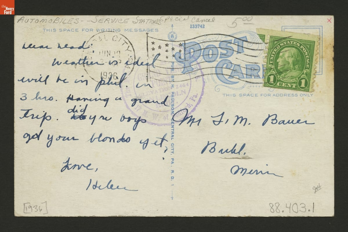 Postcard, Grand View Point Service Station, 17 Miles West of Bedford, Pennsylvania, 1936